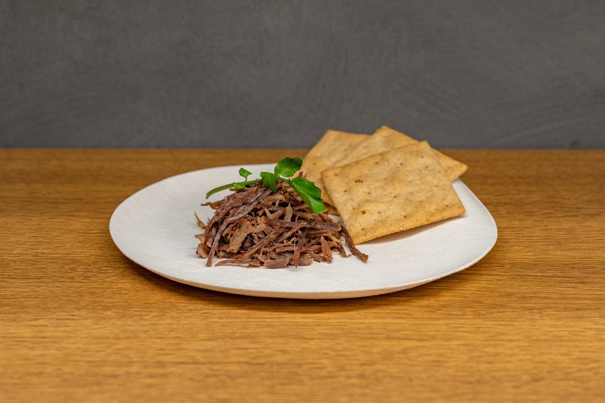 和牛ランプを約一週間、自家製の調味液でマリネし、しっかり塩抜きした後、旨味だけを閉じ込めます。4時間蒸し上げて余分な脂を落とし、丁寧に手でほぐして刻んだ生胡椒とあわせてあります。ジャーキーのような食感もある、まじりっけないコンビーフです。