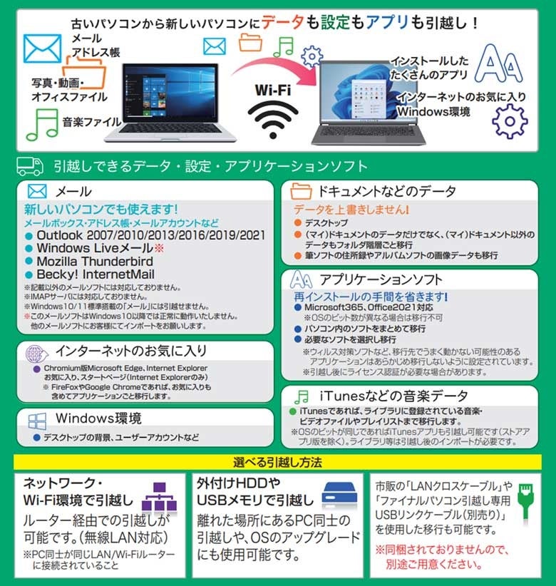 「ファイナルパソコン引越しWin11対応版(POSA)」は、Windows11対応、累計販売本数1300万本突破のパソコンデータ移行ソフトの最新版(POSA)です。パソコンのデータ、設定、アプリなどを丸ごと移行します。よりシンプルな画面構成で、わかりやすい操作画面になりました。移行するアプリも選択でき、パソコン初心者でも手間なく作業を行えます。また複数アカウントの移行や、やり直し機能、レジューム機能など便利な機能も搭載。Wi-Fi環境を利用して、ケーブル接続等無しに移行可能。また、有線LANケーブルや外付けHDD、USBメモリ、市販の「LANクロスケーブル」や「ファイナル引越し専用USBリンクケーブル(別売り)」を使用した移行も可能です。更にOSのアップグレード時にもご使用いただけます。