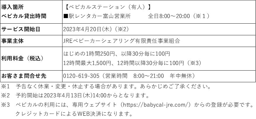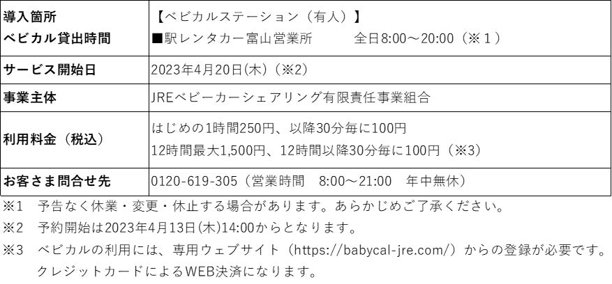 ◆今回、JR西日本レンタカー&リース株式会社と連携し、4月20日(木)よりJR富山駅近くの駅レンタカー富山営業所サービスを開始いたします。北陸3県での貸出はベビカルとして初となります。