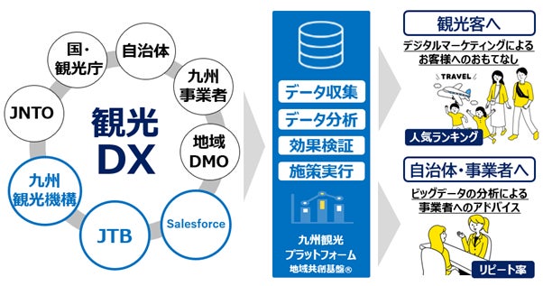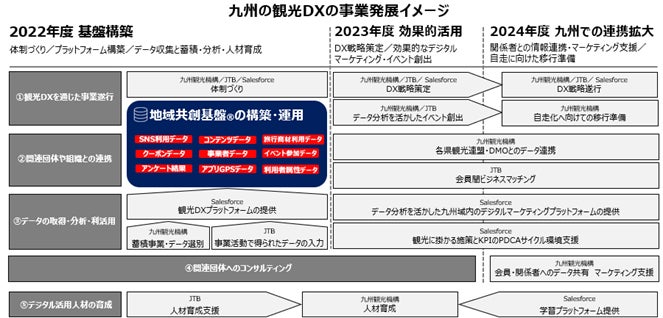 本協定に基づき、1年目にJTBとSalesforceは、Salesforce Service CloudやTableauなどを導入して地域DMO(注2)、運輸局、観光事業者との情報連携を効率的に行うほか、同機構の会員企業との相互利用可能なシステム環境を整備し、各地域の観光DXのモデルとなる「九州観光プラットフォーム」を構築します(JTBの投資開発にて先行して構築)。その後、九州観光機構は、保有する各種事業データを収集、九州観光プラットフォームに蓄積します。並行して、DXの推進体制作り、学習支援、専門家派遣、観光庁事業の取組み、会員組織との連携を進めていきます。2023年度には Salesforce Experience Cloudによるデータ連携やビジネスマッチング、2024年度にはSalesforce Marketing Cloudによるデジタルマーケティングプラットフォームの実現をしてまいります。
