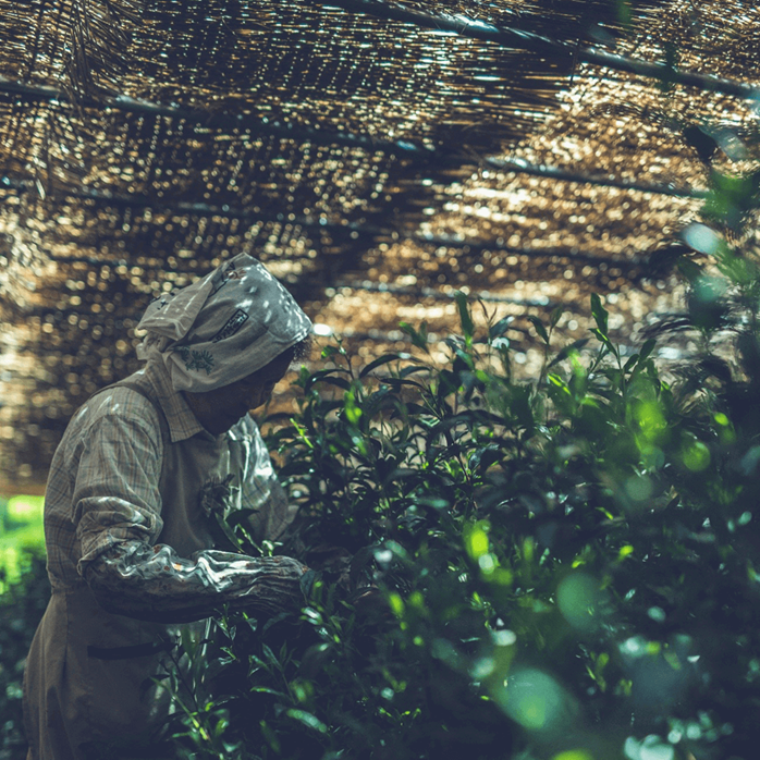 八女伝統本玉露とは、福岡県八女市及び周辺地域特有の気候と土壌によって育てられる高品質の玉露です。この地域では、朝霧の発生を促す気温差が特徴的で、この気温差が植物の呼吸を抑制し、茶葉のうま味成分を高めてくれます。また、八女では、新しい茶の芽が1枚出たら、その新芽を傷つけないように、茶畑を藁で編んだ「すまき」という棚で覆います。他の栽培地域では化学繊維を使うのに対し、八女では今も伝統的な藁を使用。あえて手のかかる伝統的な方法に拘る理由は、化学繊維だとどうしても畑の温度が高くなりすぎるのに対し、藁の場合には茶畑内の気温を低く保ってくれるから。さらに雨が降れば藁が湿度を吸収し、天気が続けば藁の水分を放出するため、湿度も最適に保つことができます。日本全国の茶の産地の中で藁を使った「すまき」を作るのは今では八女のみとなり、藁を「すまき」に編む機械も現在では八女にしか存在していません。加えて手摘みによる丁寧な収穫と熟練の職人による加工が、美しい外観と複雑な味わいを生み出します。