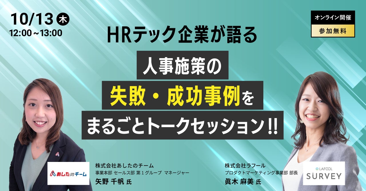 今回、人事評価サービスを提供する株式会社あしたのチームと、 組織改善ツール『ラフールサーベイ』を提供するウェルビーイング/人的資本経営支援の株式会社ラフールが、 人事施策の成功/失敗事例について対談形式でお伝えします。