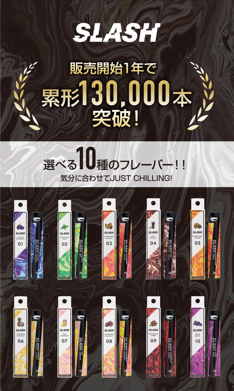 『SLASH』は、株式会社TIMEが企画・販売を手掛けるVAPEブランドです。リキッド(原料にタバコの葉を一切含まない)をバッテリーで加熱し、煙(水蒸気)として吸引することができます。タバコ特有の臭いがないため、室内や車内、デートの合間など、利用シーンを選ばず使用できます。