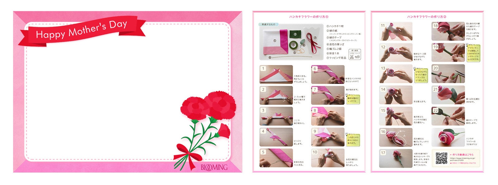 キャンペーンに合わせて、ハンカチフラワーの作り方と母の日オリジナルメッセージカードをご用意しました。