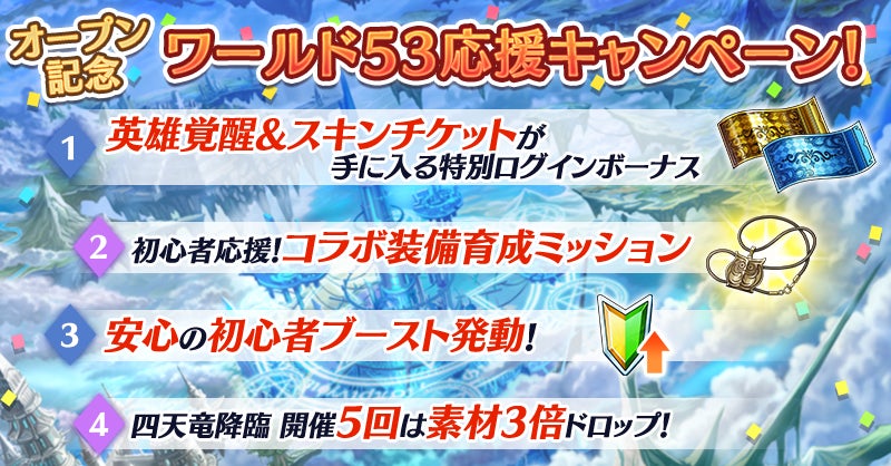 ワールド53オープンを記念して、転生以外の新規で始めたプレイヤー限定の「初心者応援ログインボーナス(30日間)」を実施!