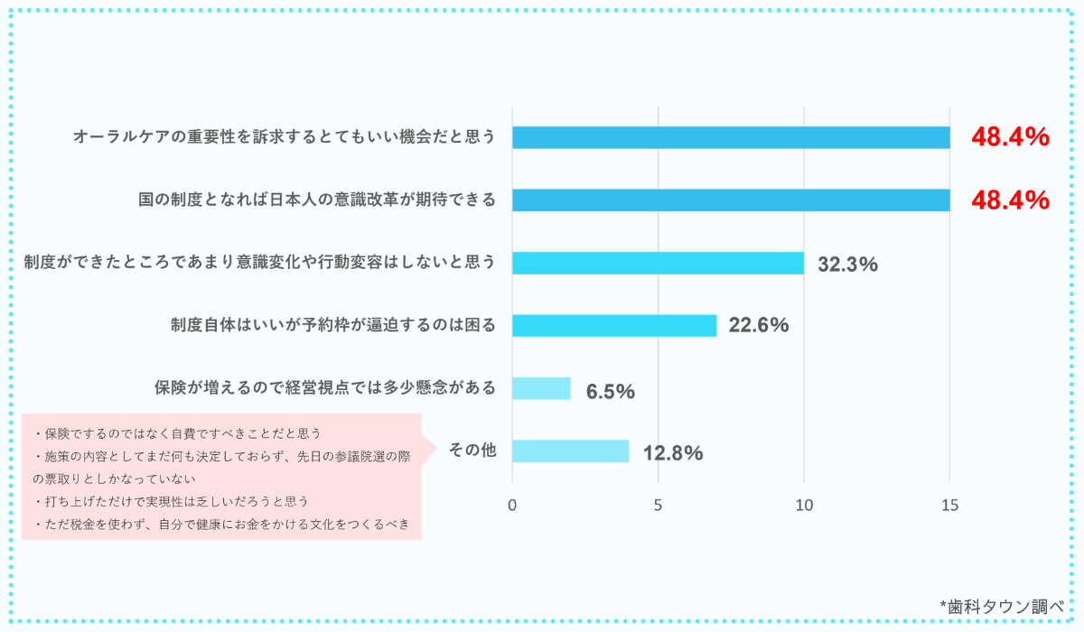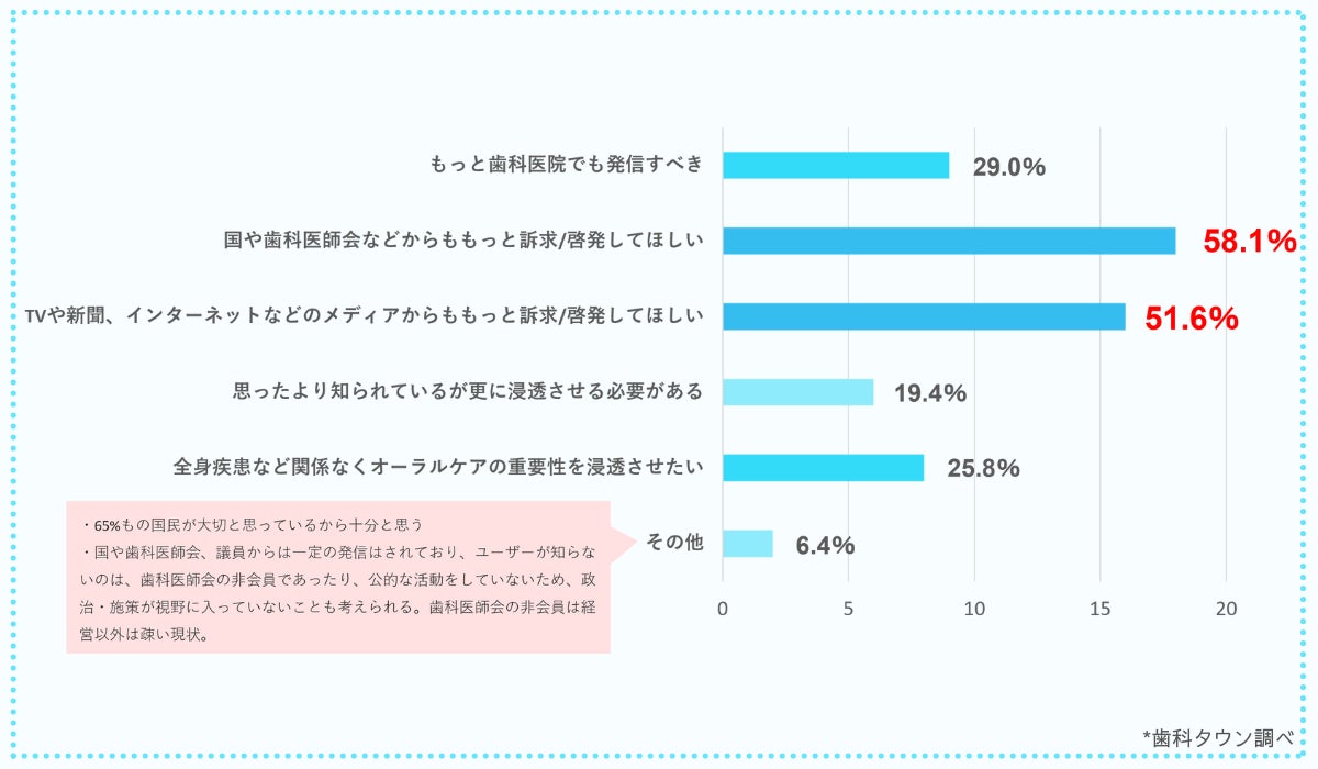 今回はこの結果に対する意見として、「国や歯科医師会などからももっと訴求/啓発してほしい(58.1%)」「TVや新聞、インターネットなどのメディアからももっと訴求/啓発してほしい(51.6%)」など、もっと積極的な情報発信が必要であるとの歯科医師からの意見がありました。
