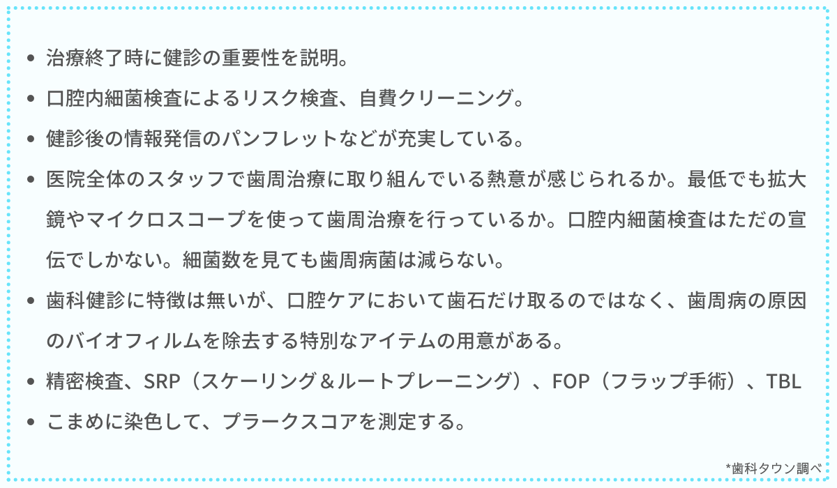 質問⑥:歯科健診に力を入れている・得意としている医院の特徴はありますか? どのような点を見て判断すればいいでしょうか。