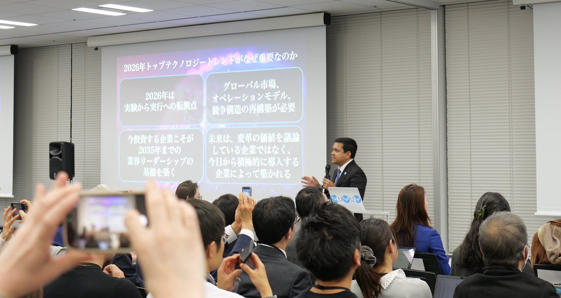本セミナーでは、シリコンバレーを拠点に、OpenAI、Anthropic、xAI、SpaceX など世界最先端スタートアップへの投資実績を持つ当社創業者兼CEOのアニス・ウッザマンが、AI、ロボティクス、ディープテックを中心に、2026年に注目すべきテクノロジートレンドを、シリコンバレーの投資最前線の視点から具体的事例を交えて解説しました。