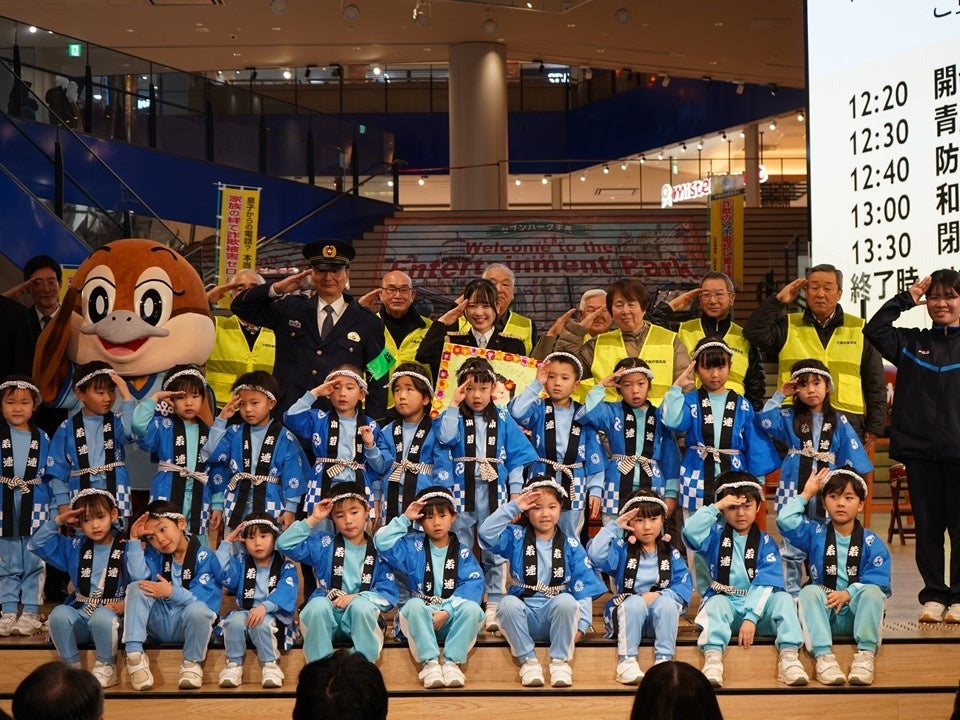 続けて、地元 星の光幼稚園の子供により、「松原市内から特殊詐欺はどっかへ飛んでいけ!」という力強いメッセージをこめた和太鼓の演奏が披露された後、松原市での特殊詐欺被害が増加している現状を受け、青原支援官から、「突然ご自宅に電話がかかってきて、『ATMでお金が返ってくる』というのは詐欺です。また、突然パソコンがウイルスに感染したなどと表示され、『コンビニ等で電子マネーを購入させ、パソコンの修理費用を支払わせる』というのは詐欺です。このようなことを見たり聞いたりしたときは、警察への情報提供をお願いします。そして、ご親族の皆さんや、地域の皆さんで、被害に遭わないように声を掛け合ってください。みんなの力を合わせて、特殊詐欺をなくしていきましょう!」というメッセージが送られました。