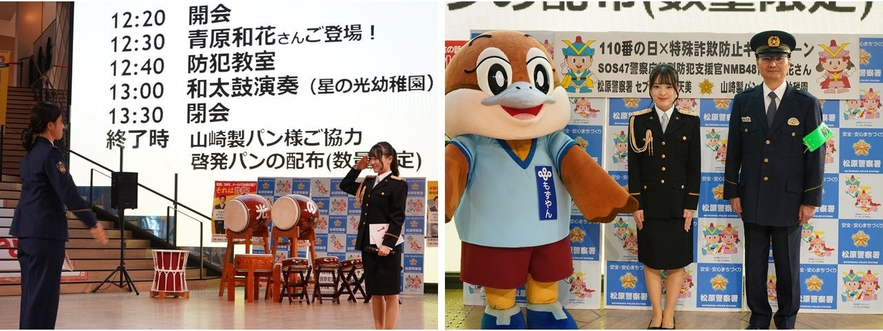 この度、大阪府の松原警察署主催の特殊詐欺被害防止イベントが開催され、NMB48 青原 和花 特別防犯支援官が出席、特に被害が増えている「還付金詐欺」をはじめとする特殊詐欺の被害防止のための注意喚起を呼びかけました。