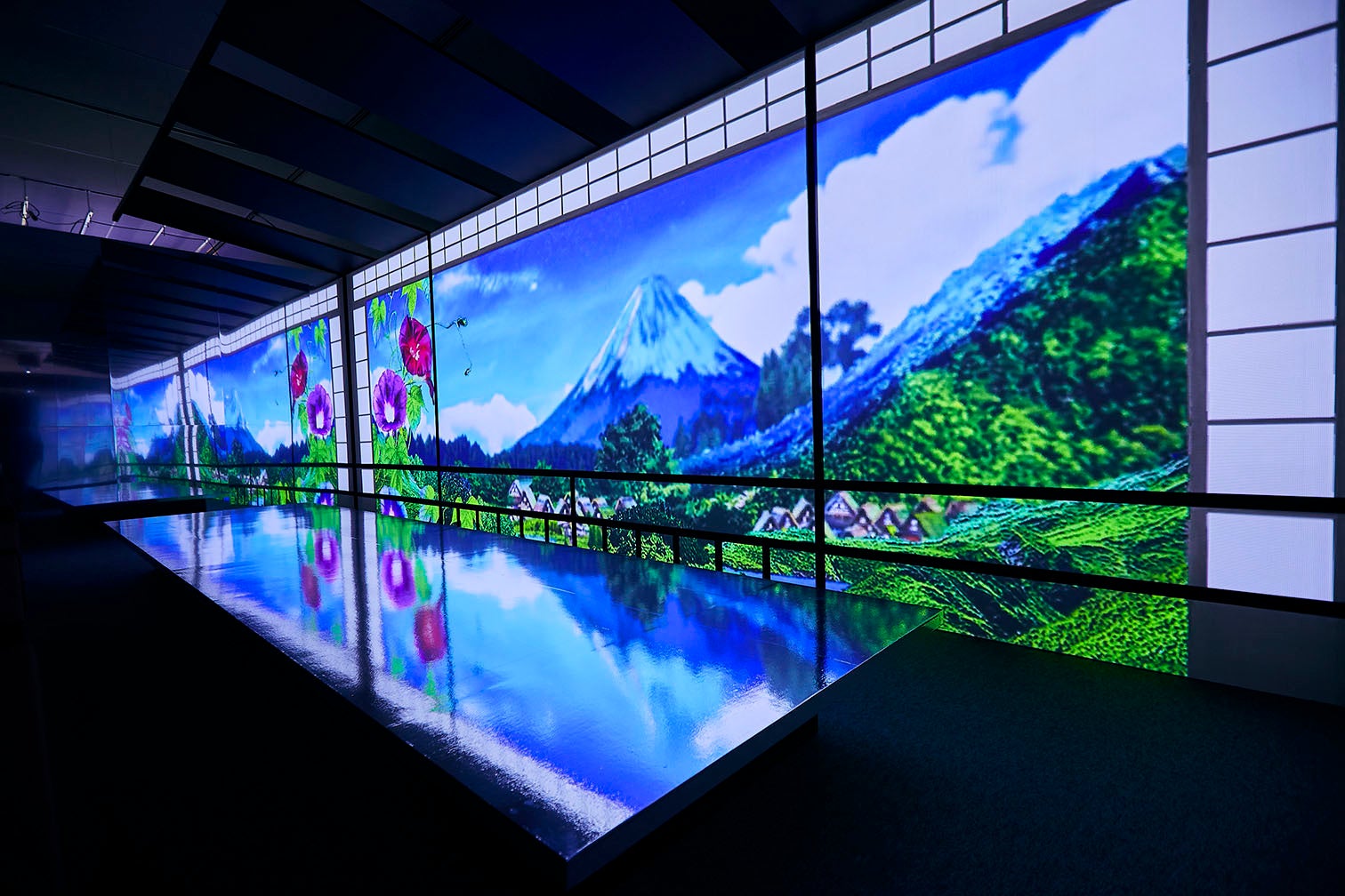 立体映像空間で鮮やかな浮世絵の世界に没入できる体感型デジタルアートミュージアム。大海や荒波のダイナミックな作品の「水の表現」への没入体験と幻想的な青の空間に浸る唯一無二の浮世絵空間。