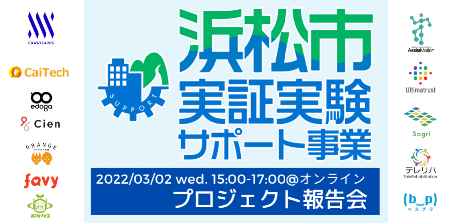 浜松市では、浜松市実証実験サポート事業の令和2年度に採択された企業7社と、令和3年度に採択された企業5社に登壇いただき、各実証実験プロジェクトの取組報告を3月2日(水)15:00〜17:00にオンラインで行います。