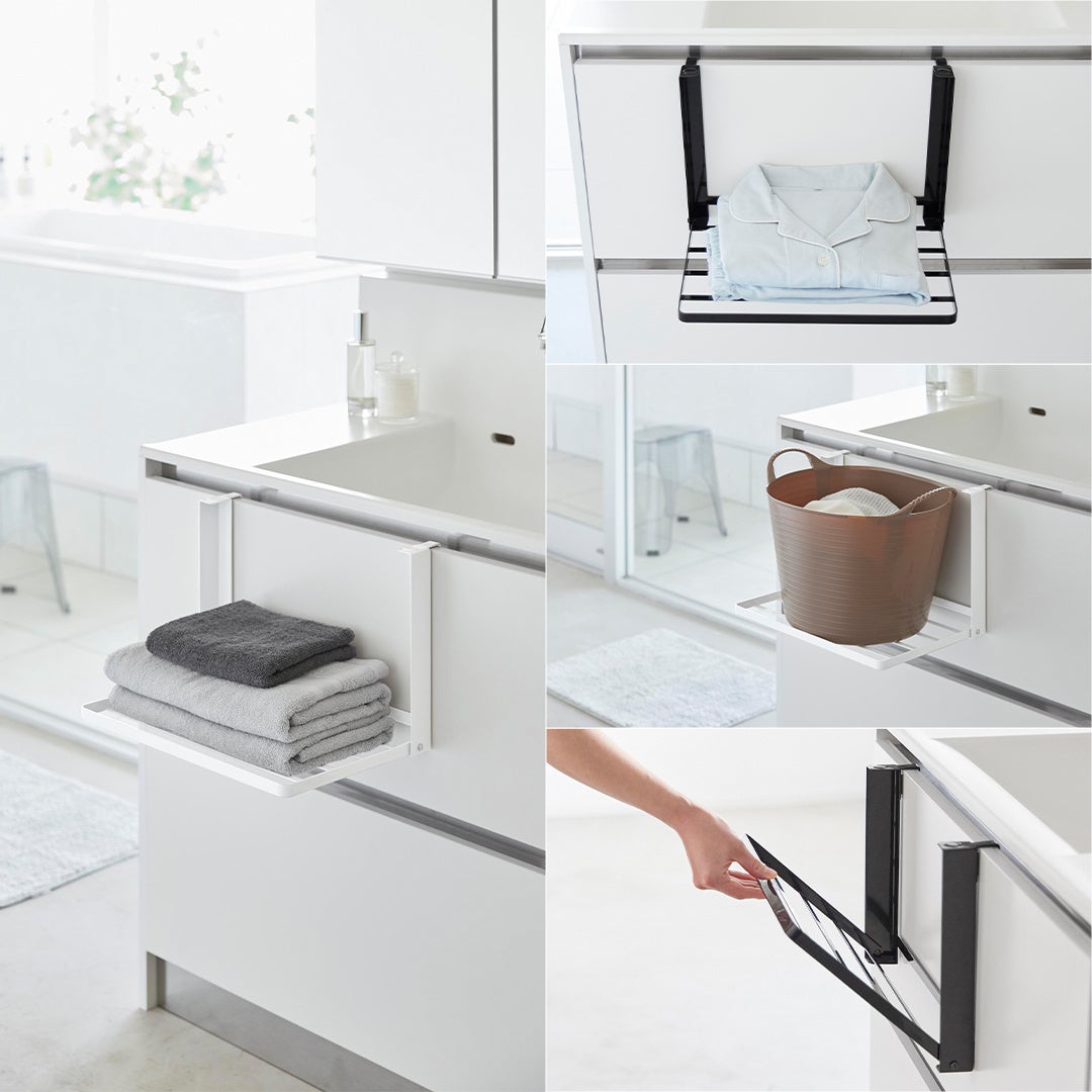 入浴後の着替えやタオルなどの一時置きにも便利な省スペースに使用できる折り畳み棚。