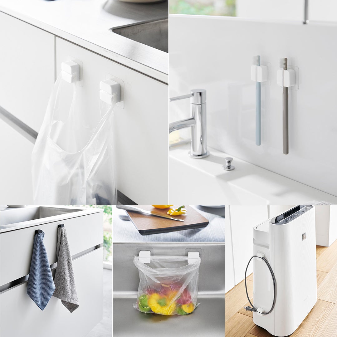 キッチンや洗面所で使えるシリコーンフックや、洗面台の扉に引っ掛けて使える折り畳み棚など、新商品発売しました。