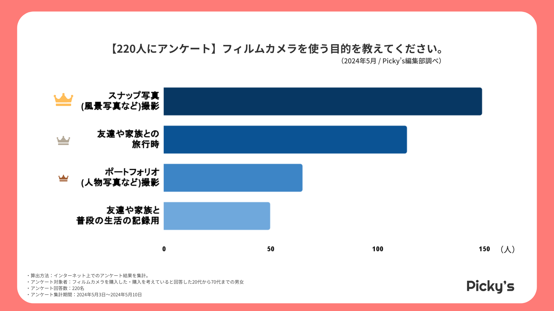 アンケート結果によると、フィルムカメラを使う主な目的として最も多かったのは「スナップ写真(風景写真など)撮影」でした。