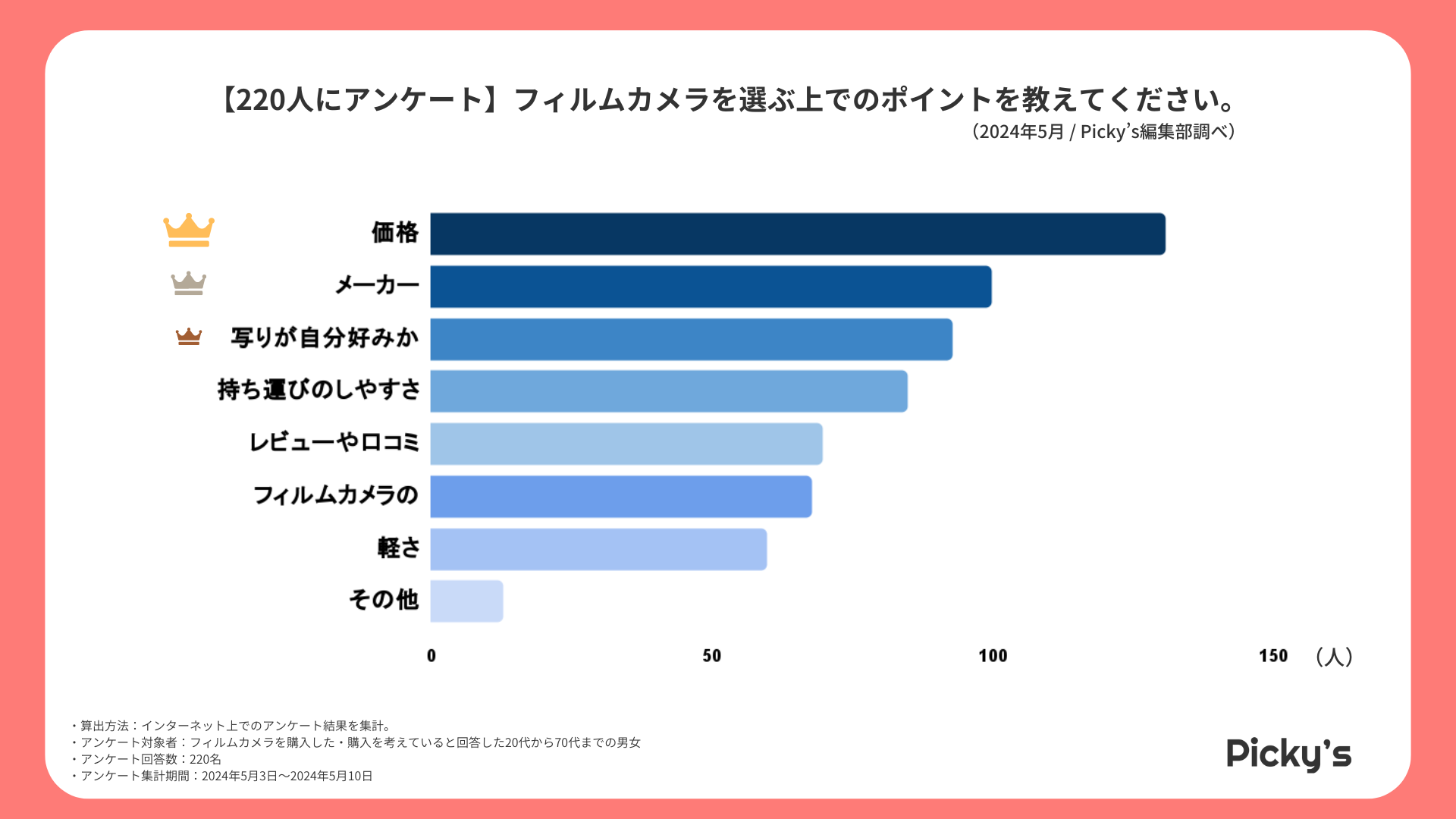 アンケート結果によると、フィルムカメラを選ぶ際のポイントで最も多かったのは「価格」でした。