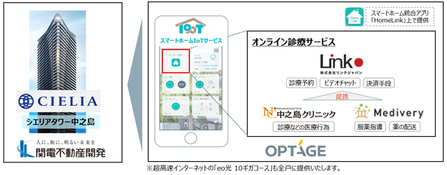 本サービスは、診療サービスを提供する「中之島クリニック」、服薬指導サービスを提供する「株式会社メディバリー」、診療予約およびビデオチャット・決済手段などをアプリケーション上で提供する「株式会社リンクジャパン」が連携し、“入居者の健康増進”と“安心な暮らし”を実現するために、オプテージのスマートホームIoTサービス「IOPT」上で提供するサービスです。