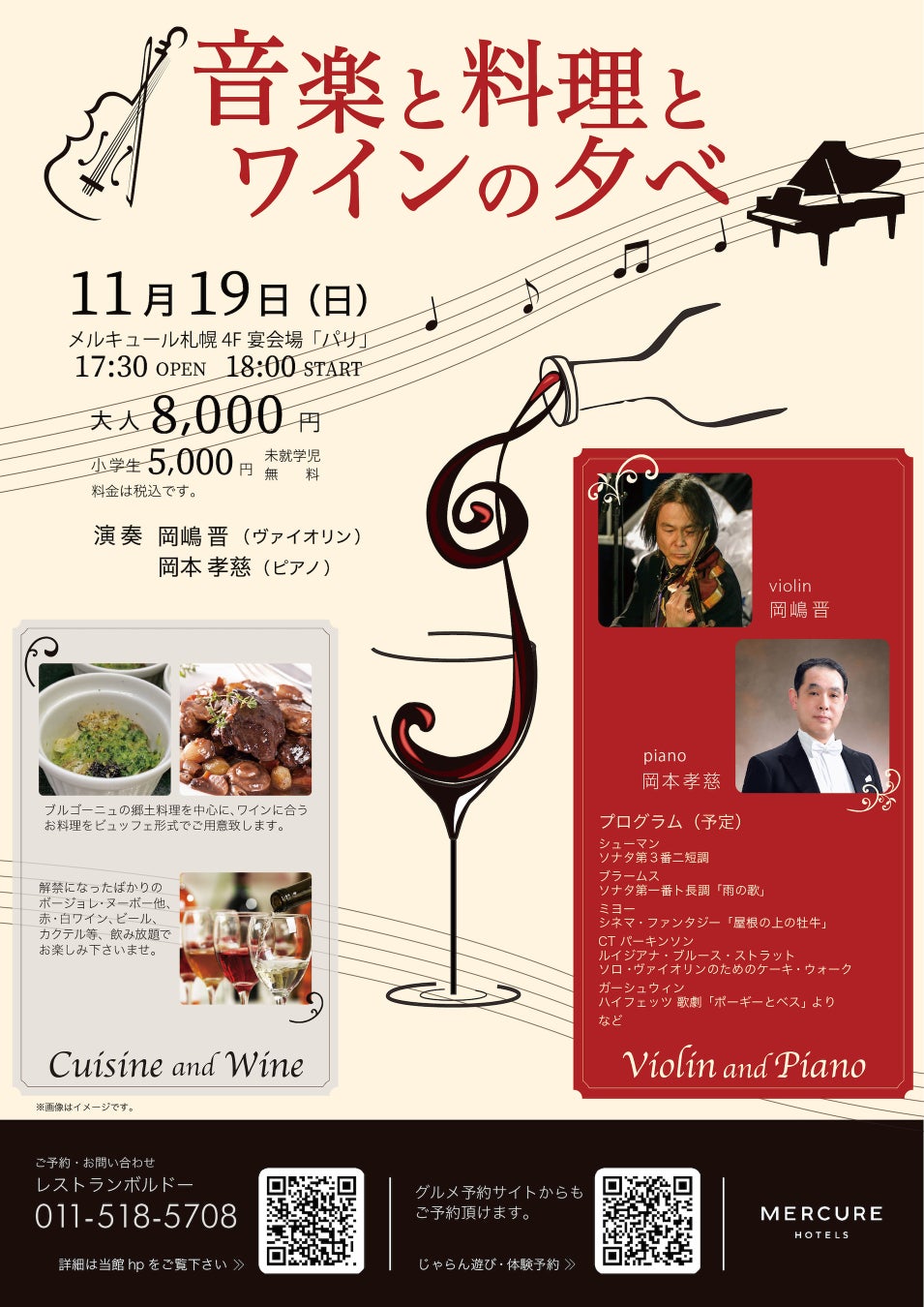 【メルキュール札幌】11/19(日)『音楽と料理とワインの夕べ』を開催。上質な音楽とフレンチビュッフェ、そしてボージョレ・ヌーボーのマリアージュをご堪能ください。