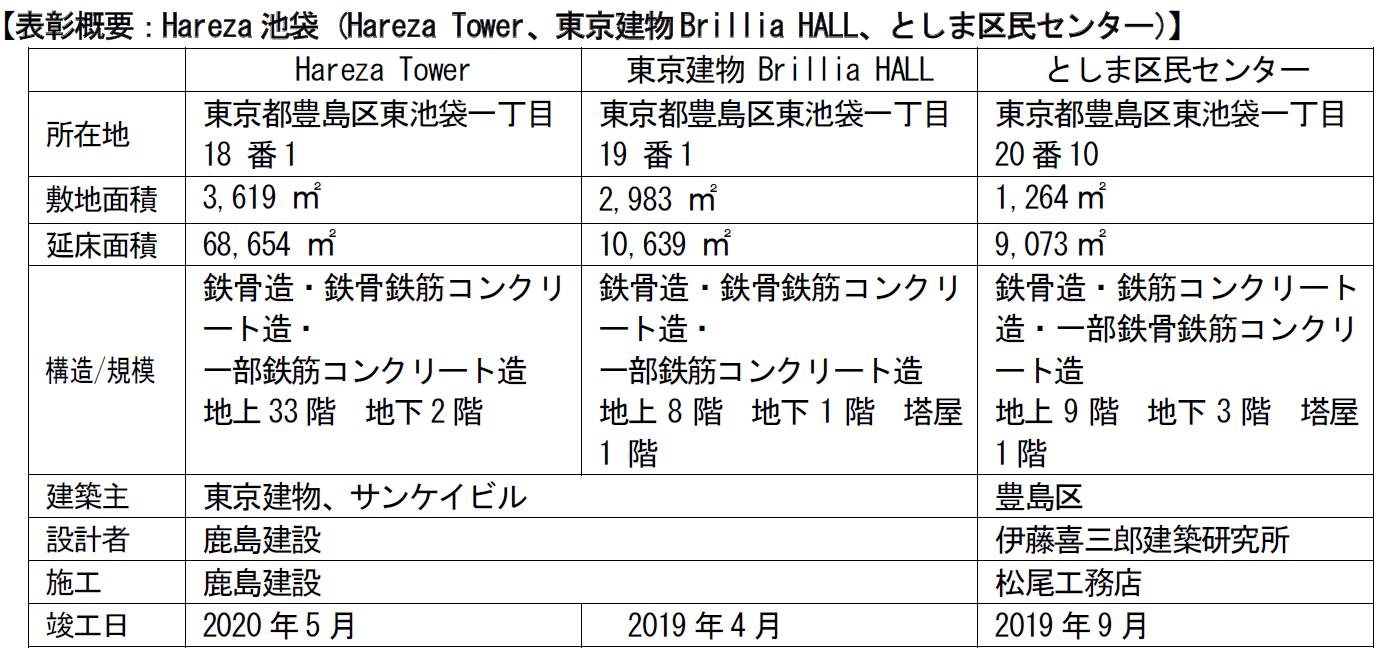 豊島区(区長:高野 之夫)、東京建物株式会社(本社:東京都中央区、代表取締役 社長執行役員:野村 均、以下「東京建物」)、株式会社サンケイビル(本社:東京都千代田区、代表取締役社長:飯島 一暢、以下「サンケイビル」)、鹿島建設株式会社(本社:東京都港区、代表取締役社長:天野 裕正、以下「鹿島建設」)、株式会社伊藤喜三郎建築研究所(本社:東京都豊島区、代表取締役社長:森嶋 浩、以下「伊藤喜三郎建築研究所」)、株式会社松尾工務店(本社:神奈川県横浜市、代表取締役会長CEO:松尾 文明、以下「松尾工務店」)は、Hareza 池袋(豊島区東池袋一丁目、2020 年7 月全体開業)において、6 者共同で一般社団法人日本建設業連合会「第63 回BCS 賞」を受賞しましたのでお知らせいたします。