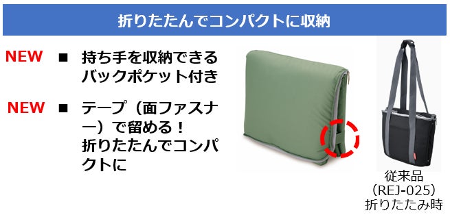このたび、従来品をお使いいただいているお客様の「折りたたみ時のスナップボタンを留めやすくしてほしい」、「持ち手を収納できるようにしてほしい」などの声を受け、より折りたたみやすい仕様にリニューアルしました。また、持ち運び時に肩にかけても安定するように持ち手を短くしています。