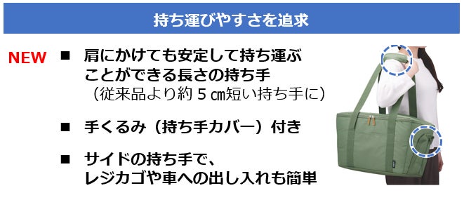 ・持ち手を約5㎝短くし、肩にかけた時の安定した持ち運びを可能に