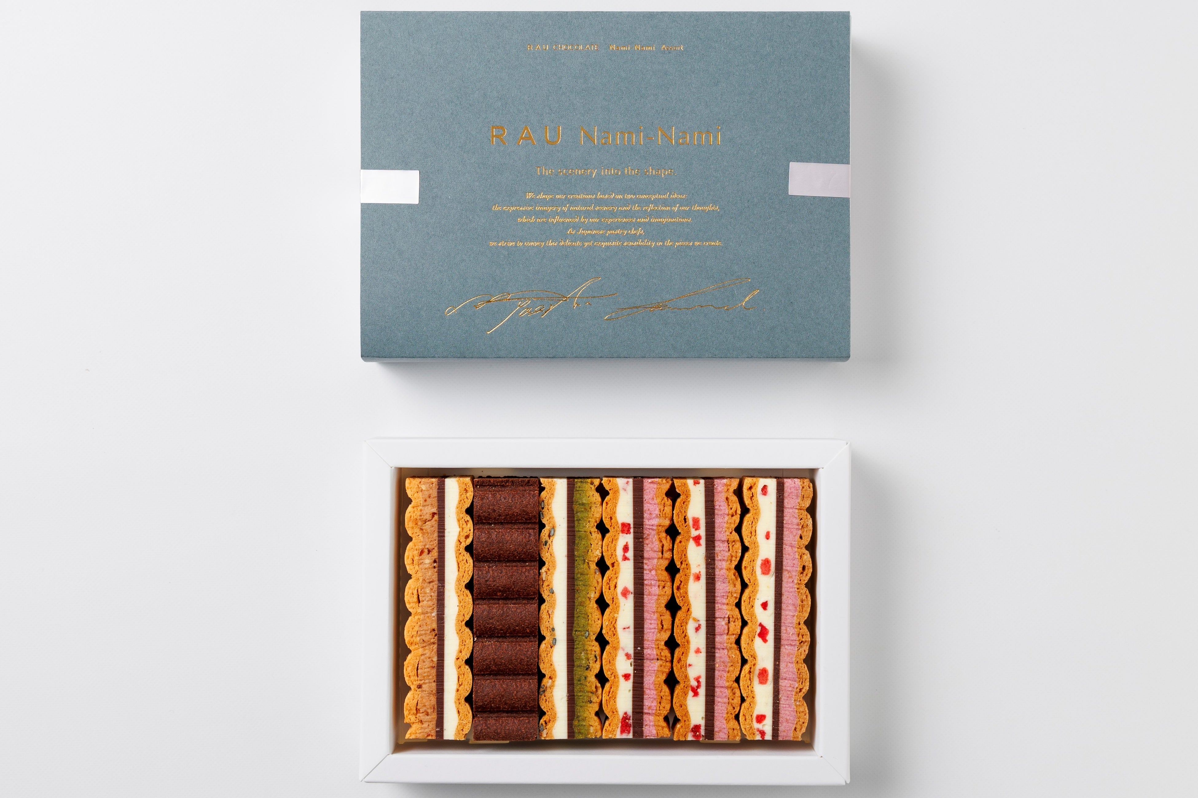 クリームサンドサブレ「Nami-Nami」は、日本とフランスの瓦屋根という共通文化からインスパイアされた波形のサブレに、チョコレートの産地であるコスタリカにシェフたちが直接赴いて選び抜いた有機カカオを使用したビーントゥバーチョコレートと味わい深い様々な食感のクリームを挟んだRAUの人気商品。発売時から世代を超えて多くの人に好まれ、京都のお土産としても人気を博しています。