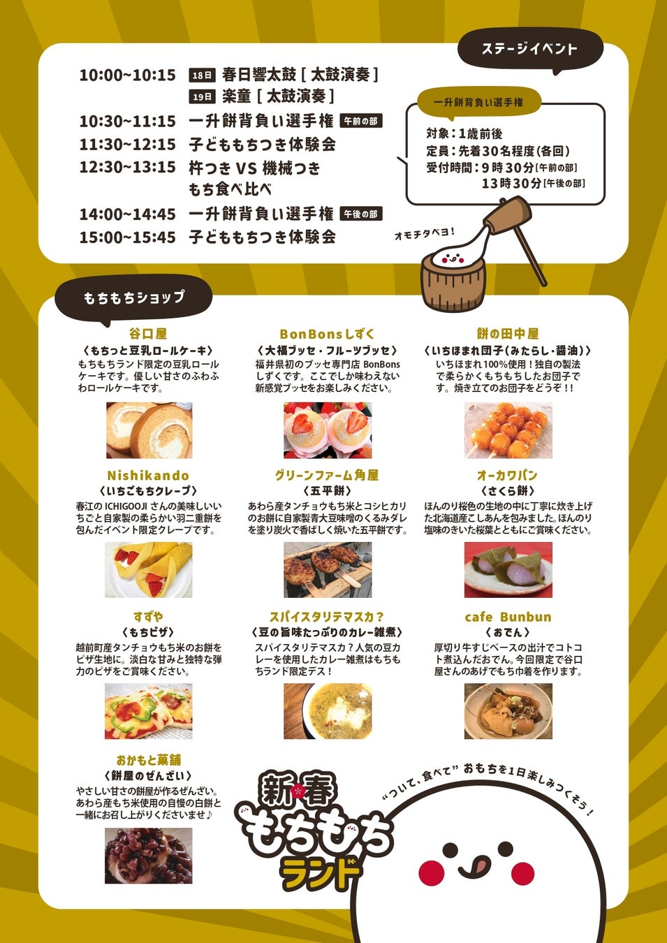 福井県あわら市で1月18日、19日に開催された「新春もちもちランド」が大成功を収めました。昨年開催されたもちもちランドに引き続き、市内外から多くの家族連れなどが来場しました。子どもたちによるもちつき体験会や一升餅背負い選手権、さらに杵つきと機械つきのもちの食べ比べなど、魅力的なプログラムやお餅グルメやスイーツのお店が並びました。