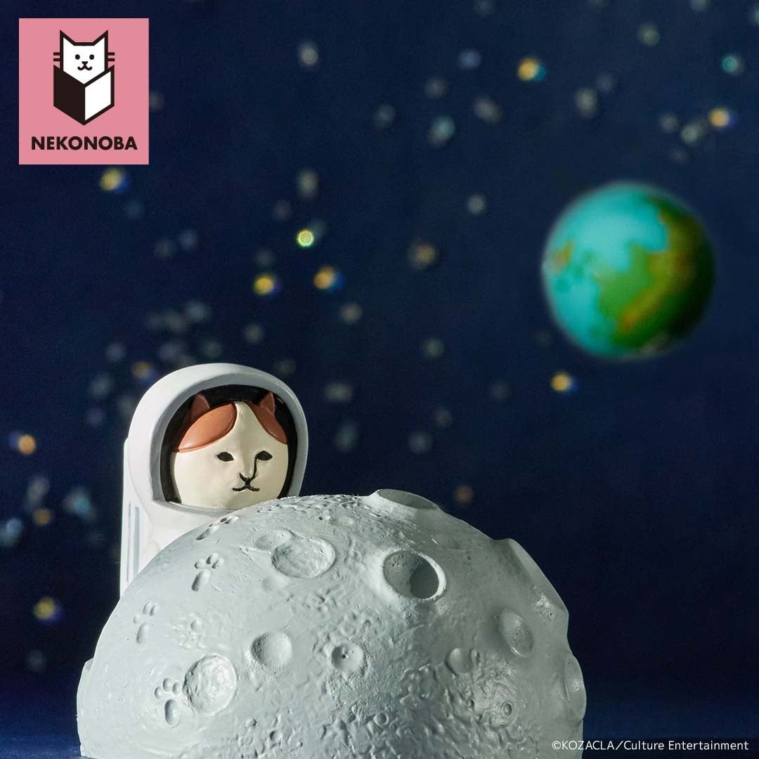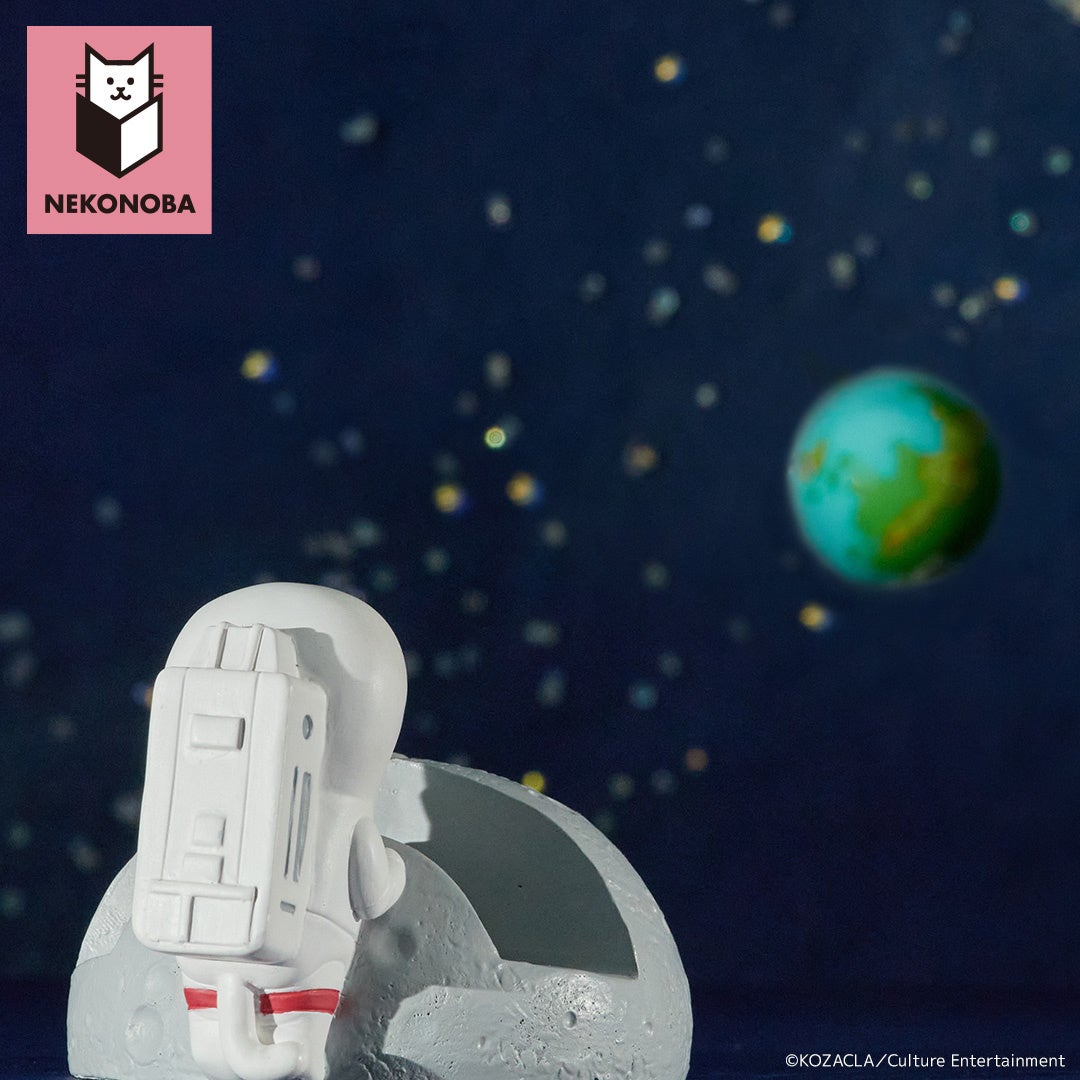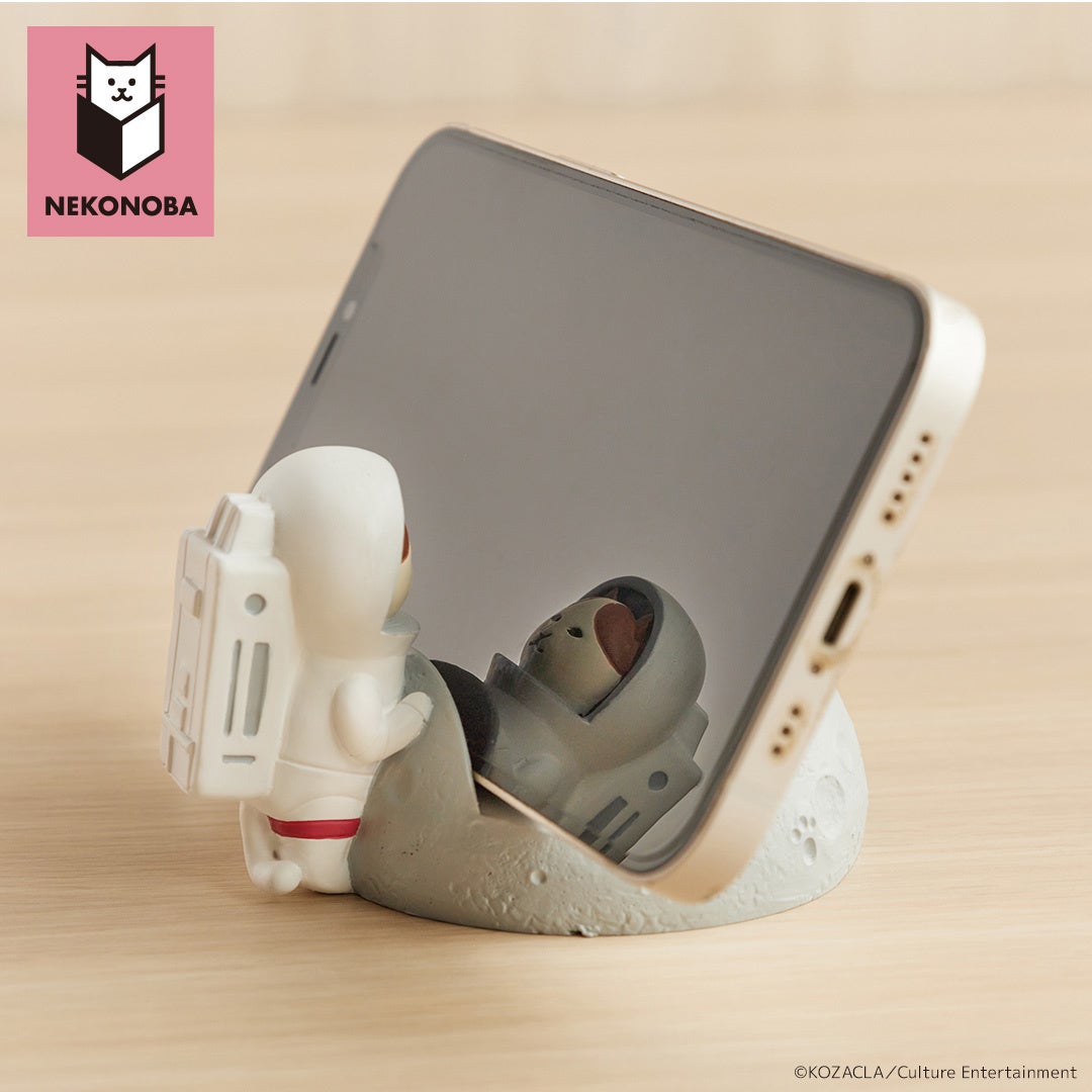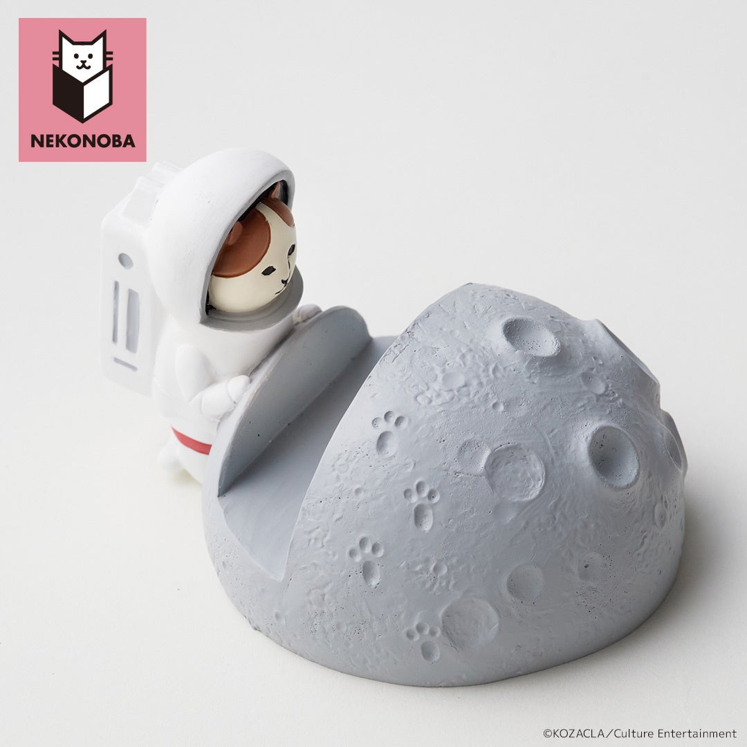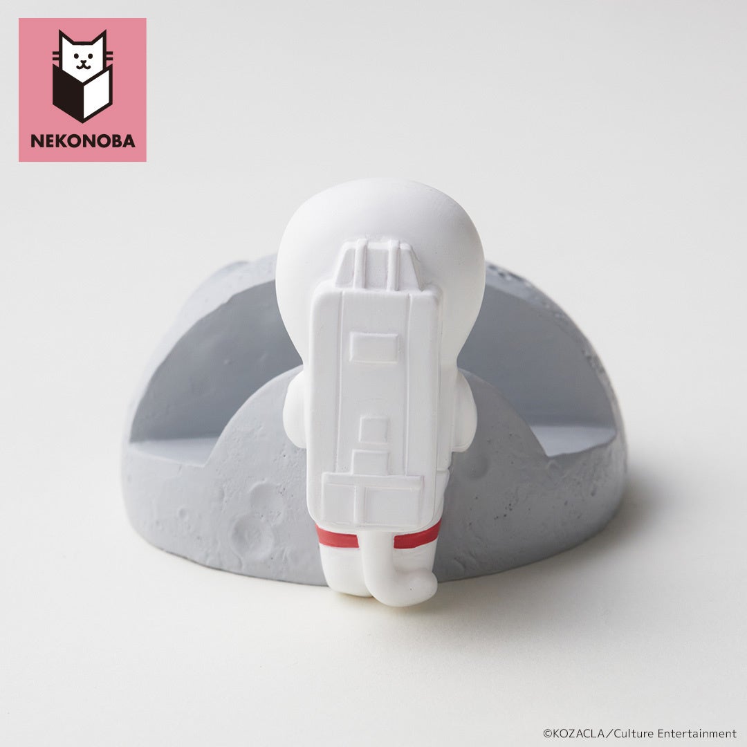 宇宙旅行を夢見るNYASAは、もちろん月面着陸したときのこともちゃーんとイメージできています。「わ~月面だ~でこぼこだ~」月面をのぞき込むNYASA。興奮はおさまりません。あ、よくみると、月面にはNYASAの足跡が!そんなNYASAの月面着陸(の夢)がスマホスタンドになりました。