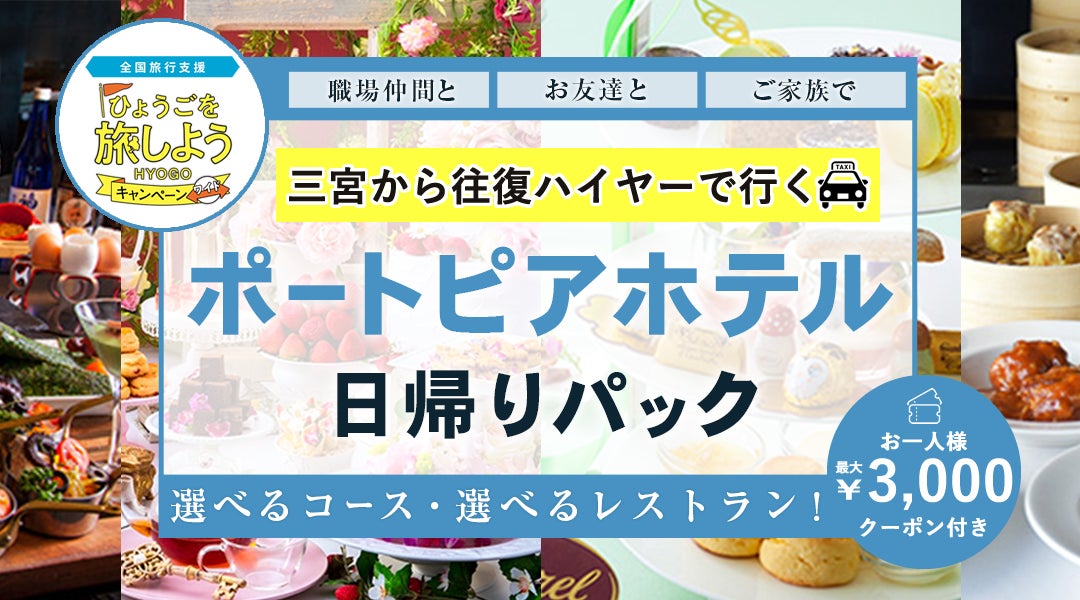 選べるポートピアホテル日帰りパックについて ポートピアホテルのレストラン3店舗から選べるコース。三宮からホテル間の往復ハイヤーとお食事がセットになったパックツアー♪ 兵庫を旅しようキャンペーンワイドを利用してお得にお食事が楽しめるプランです。