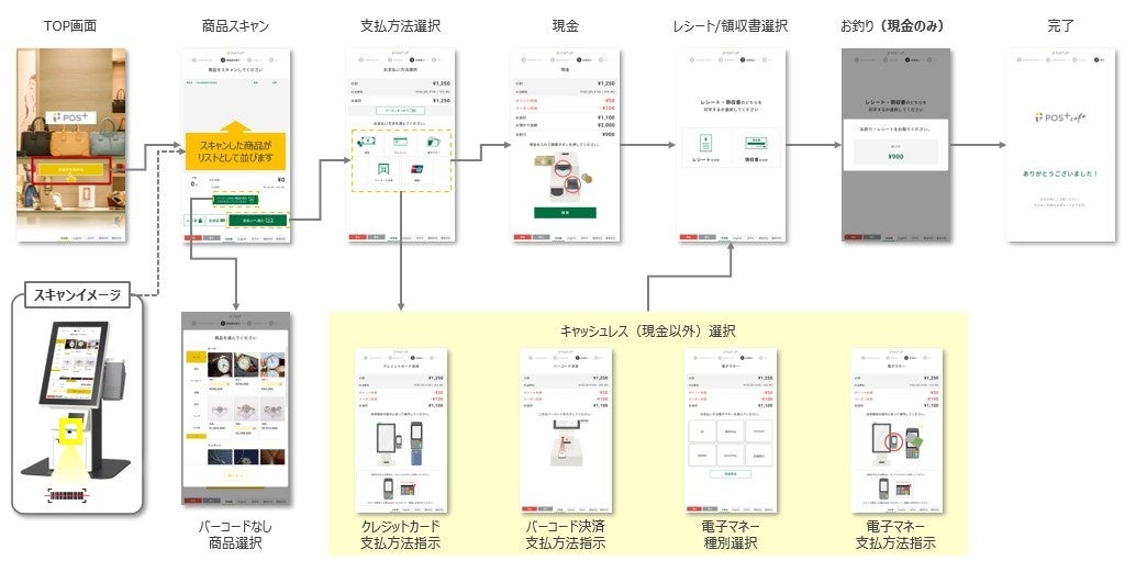 この度、新たに提供を開始するのは、既に飲食業向けに提供していた「POS+ selfregi」を、小売業向けに機能を刷新したセルフレジ・券売機です。この小売業向け「POS+ selfregi」は、バーコードスキャンや選択による商品登録から、支払い方法選択やキャッシュレス決済端末の連動による会計まで、お客様自身で操作することが可能となり、会計に対応関わる店舗スタッフの大幅な工数削減や人材不足の解決を可能にしました。また、多言語対応により、需要が急速に増えている、インバウンド対策も可能にします。