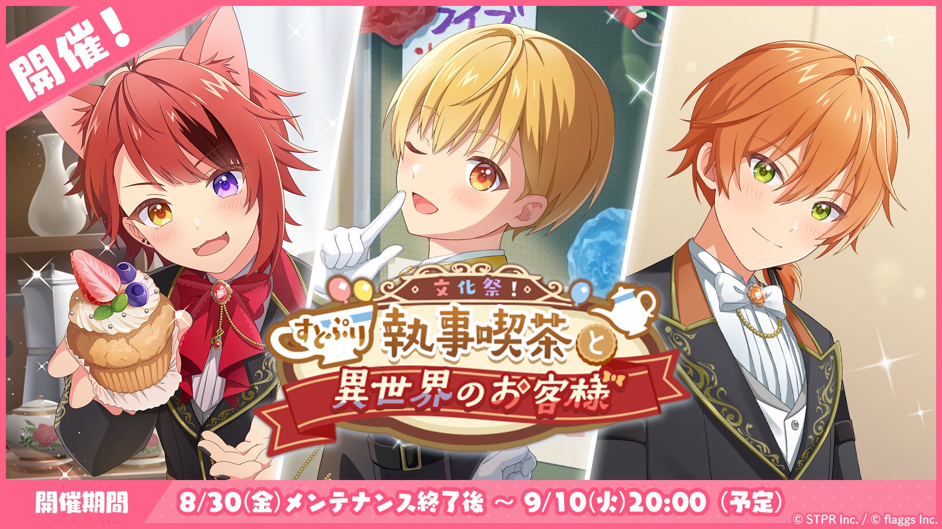 株式会社STPR(本社:東京都渋谷区、代表取締役:柏原 真人、以下STPR)と株式会社flaggs(フラッグス)(本社:東京都品川区、代表取締役CEO:吉江 直人)は、本日8月30日(金)に2.5次元アイドルグループ「すとぷり」の公式ゲームアプリ「すとぷりWith!!(通称:すとうぃず)」のゲーム内イベント「文化祭!すとぷり執事喫茶と異世界のお客様」の開催についてお知らせいたします。