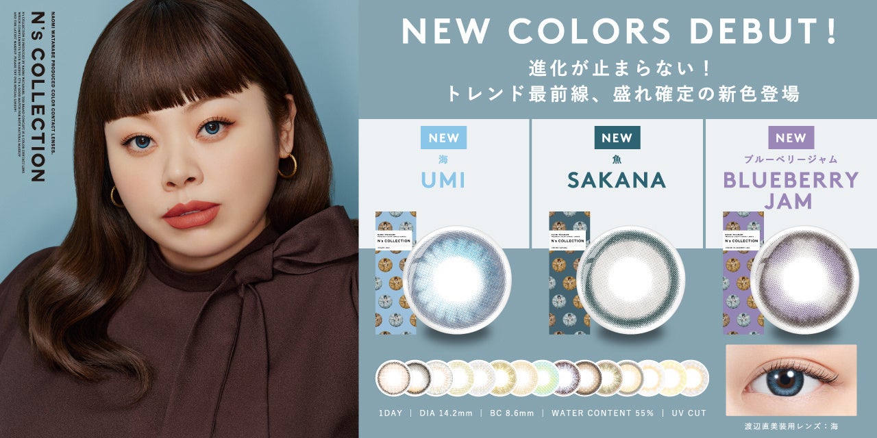 PIA株式会社(本社:東京都品川区 代表取締役:見原 博道)は渡辺直美さんプロデュースカラコンブランド『N’s COLLECTION』より新色3色を本日8月20日(火)より発売いたします。”高発色ブルー”の「海」、”透明感グレー”の「魚」、”細フチモーヴグレー”の「ブルーベリージャム」、どれも『N’s COLLECTION』らしくメイク映えするカラーリングでありながらも、元の目に馴染み、魅力を引き立てるデザインになっております。