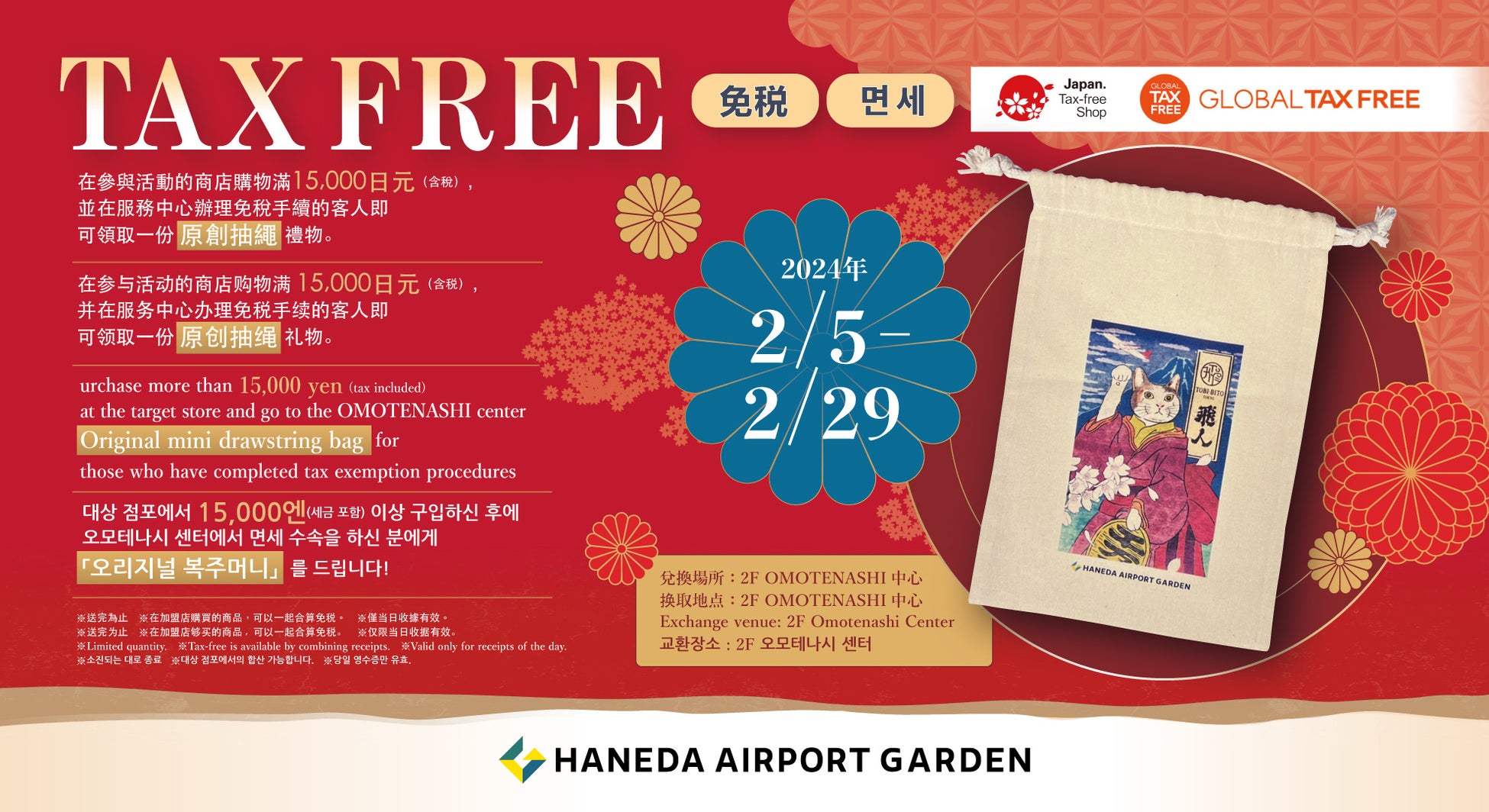 羽田エアポートガーデン内の対象店舗にて、15,000円(税込・対象店舗合算可)以上のお買い上げの方で免税手続きをされた方に「オリジナル巾着」プレゼント。