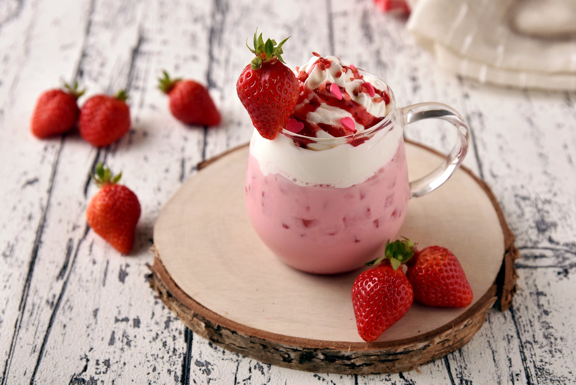 ピンクハートのシュガーをちりばめた甘い苺ミルクも登場。