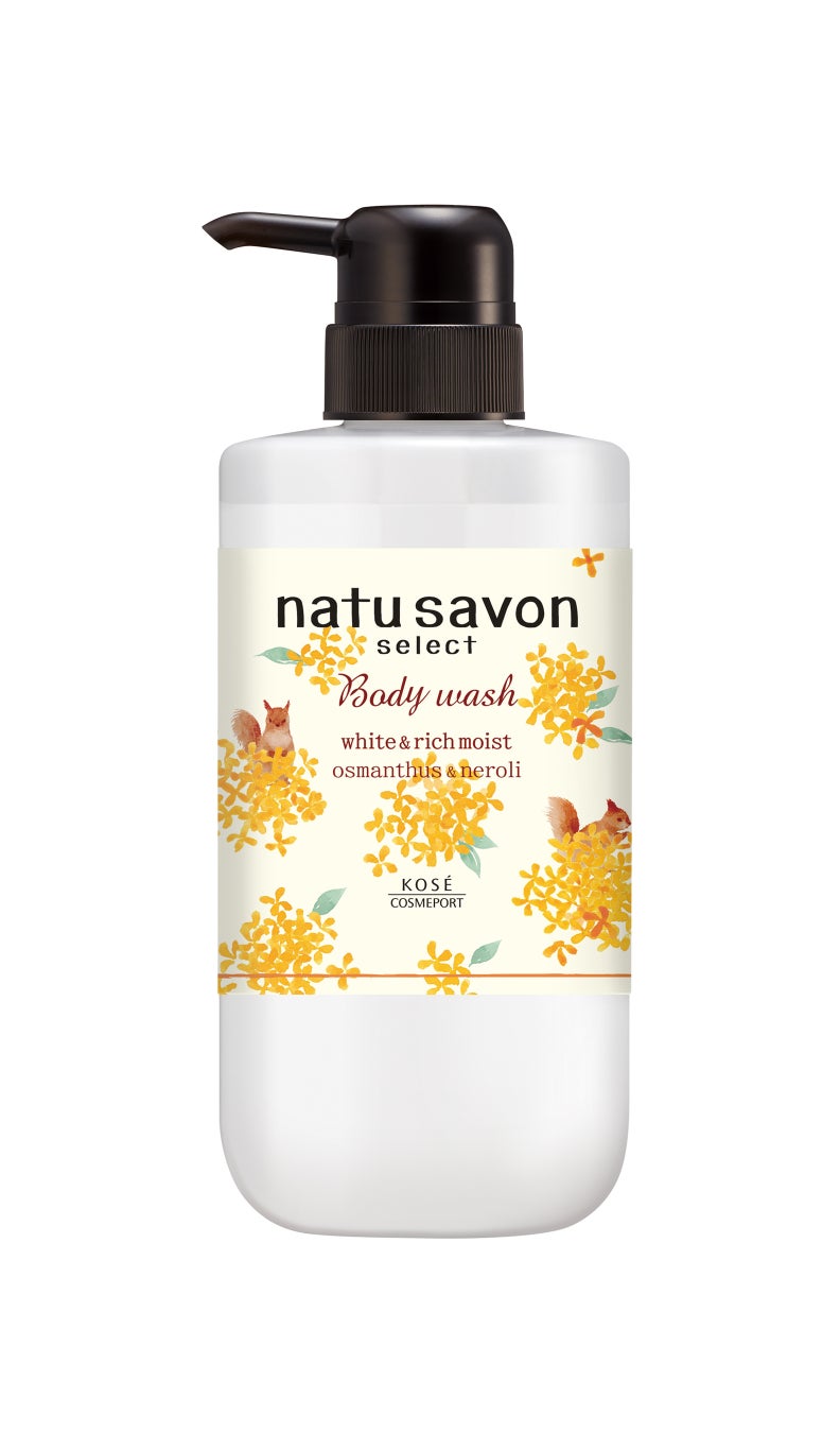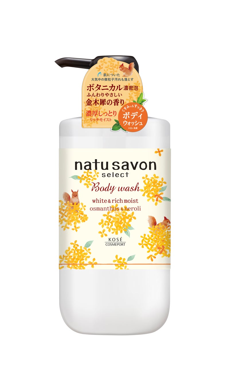 今回発売する「ホワイト ボディウォッシュ リッチモイスト 金木犀の香り」は、レギュラー品のリッチモイストタイプに、天然香料を使用した金木犀の香りが心地良く香る新商品です。さわやかなシトラスやフルーティを中心としたトップノートから、金木犀とネロリを中心としたミドルノートがやさしく香る、フルーティフローラルタイプの香調です。ボタニカルの恵みを凝縮したもっちり濃厚泡で肌をやさしく包み込み、古い角質・くすみ※1もスッキリ。肌のすみずみまで透明感あふれる、超しっとりやわらか肌へ導きます。オーガニックシアバター・オーガニックムルムルバター・オリーブオイル・アーモンドオイル(エモリエント)配合、ハトムギエキス・サボンソウエキス・グリセリン(保湿) 配合。サルフェート(硫酸系)フリー・防腐剤(パラベン)・鉱物油・着色料 フリー。