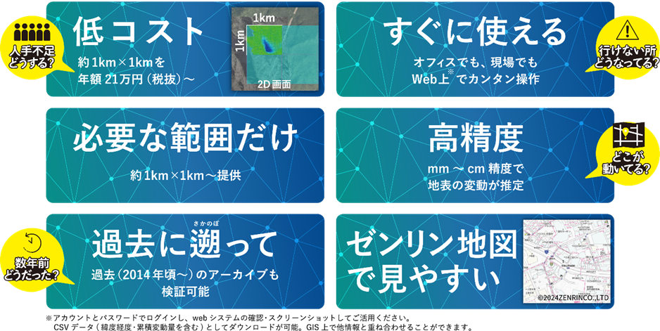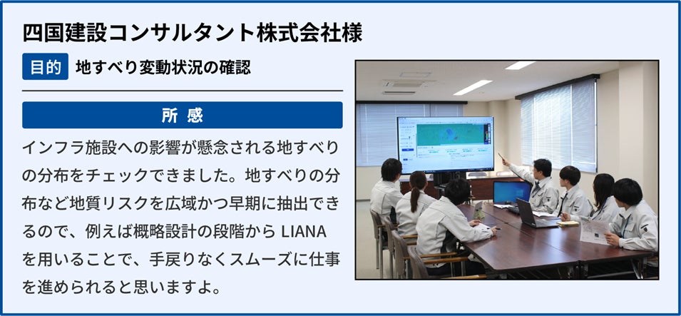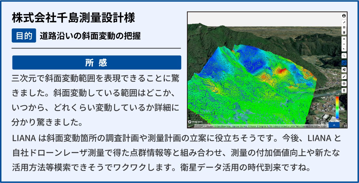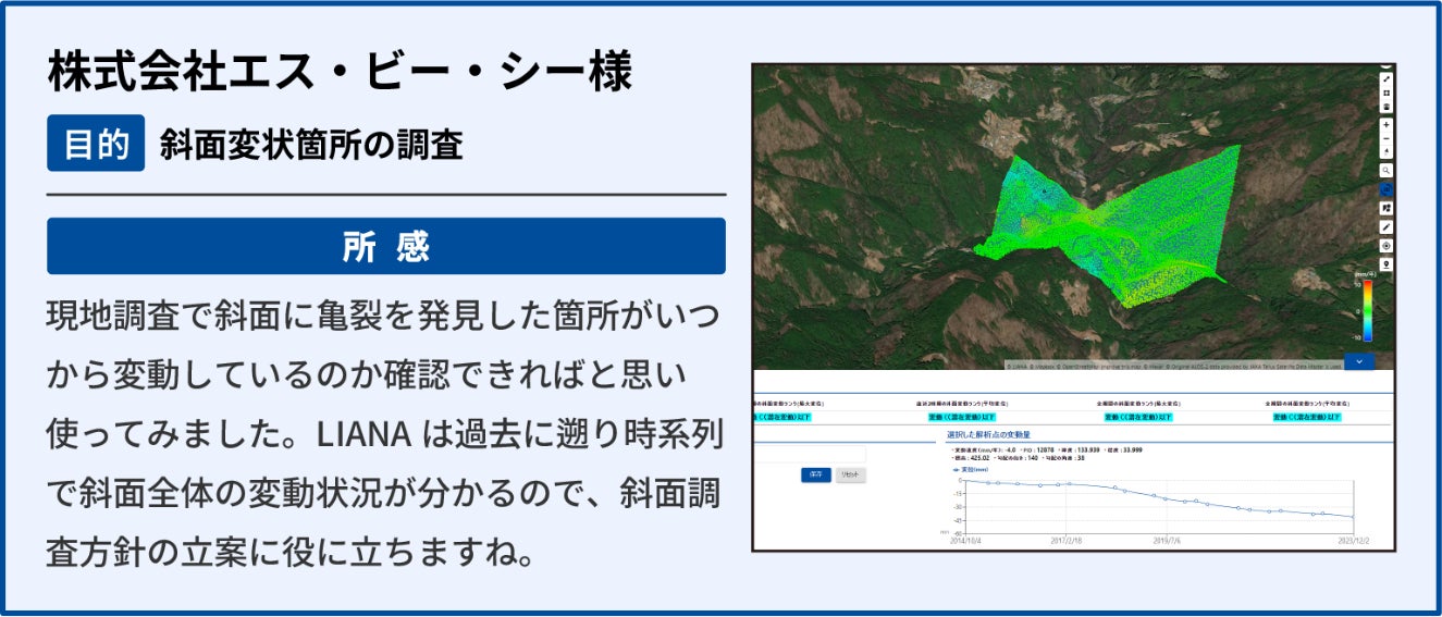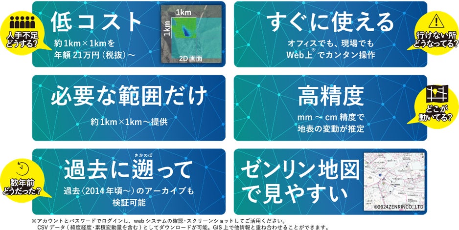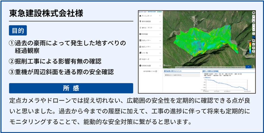 スカパーJSAT株式会社(代表取締役 執行役員社長:米倉 英一)、株式会社ゼンリン(代表取締役社長:髙山 善司)、日本工営株式会社(代表取締役社長:金井 晴彦)は、2024年3月21日より、衛星データを用いて、斜面や地盤、インフラの変動をミリメートル~センチメートル精度でモニタリングする法人および自治体向けサービス「LIANA(リアーナ)」で新たに低価格帯定額利用サービスプラン「LIANAメッシュ」(以下、メッシュプラン)の提供を開始しました。