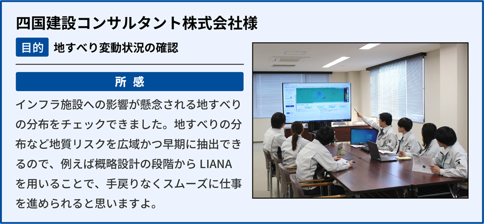 インフラ事業者の維持管理分野、建設コンサルタントの道路、河川・砂防、海岸分野における地盤調査、測量、設計の効率化、高度化、建設会社の施工分野等、幅広い企業様にご利用いただいております。