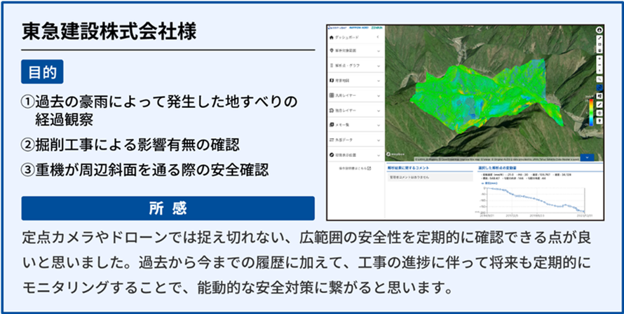 これにより、昨今頻発する災害や、社会課題となっている老朽化したインフラの増加に対し、日々少ない人手やコストで業務されている方々にとって、負担が少なく手軽にご利用可能となります。また、現場の方々の予防保全の意思決定をサポートすることにより、災害に対する不安の低減を図ることで安全・安心なまちづくりに貢献します。