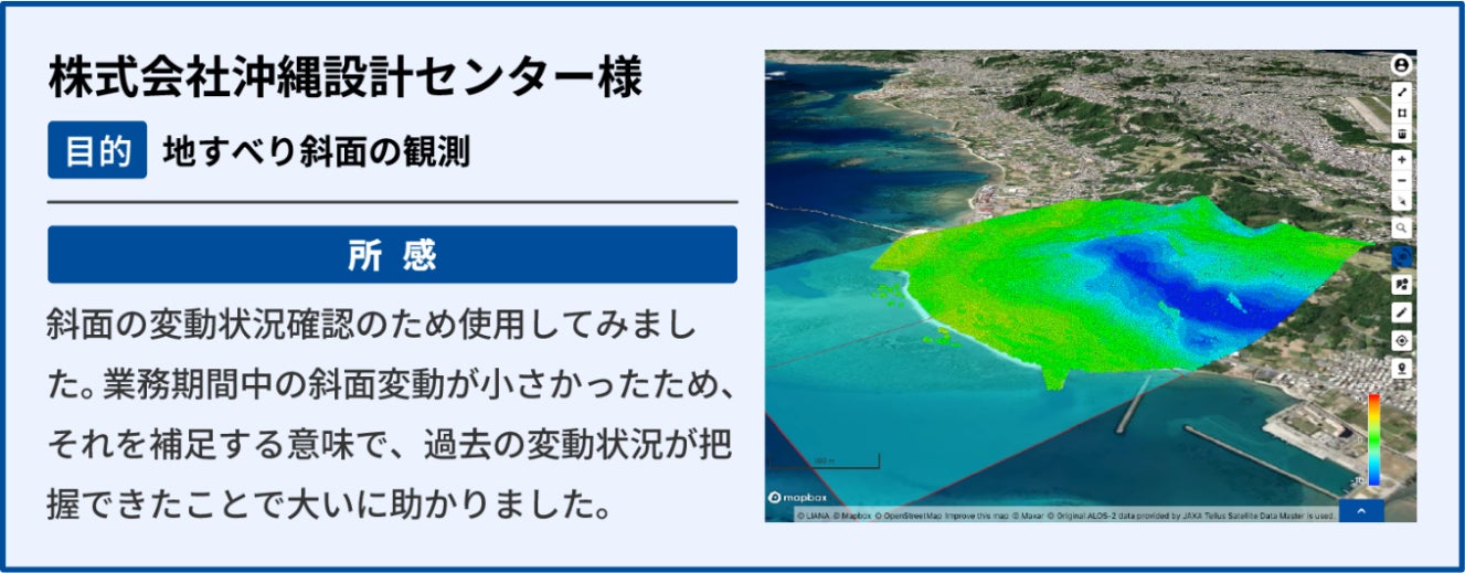 SAR(合成開口レーダー)衛星データは、広範囲の地域を一括で解析しモニタリングできる利点がある一方で、高額な費用がかかる課題があり、ユーザーは低価格で必要な範囲だけをモニタリングできるサービスを求めていました。メッシュプランはそのニーズに応え、低コストかつ定額制のサービスとして、より多くのお客様にご利用いただけるようにしました。