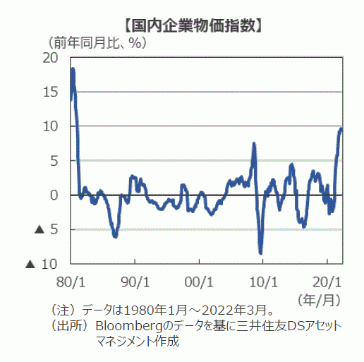 ■12日に発表された3月の国内企業物価指数は前年同月比+9.5%となり、2021年3月以降、上昇傾向が続いています。特に今年に入ってからは9%台が続いており、第二次オイルショックの影響が残っていた1980年12月以来の歴史的な水準となっています。ポイント1で挙げた中でも、ウクライナ情勢に伴って商品価格が急速に上昇したことが、足元の企業物価の上昇に拍車をかけたと言えそうです。