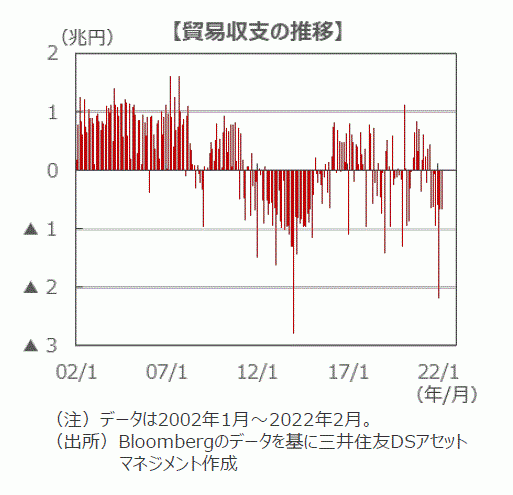 ■円安が進行しているもう一つの要因として、貿易収支の悪化が挙げられます。日本は原油や天然ガスなどのエネルギーや、多くの原材料を輸入に頼っていることから、円安によって輸入コストが増加すると、貿易収支が悪化してしまいます。貿易収支の悪化により、円買い需要が低下するため、円安となります。こうして、足元の円安は貿易収支の悪化を通じて、さらに円安を生む様相となっています。