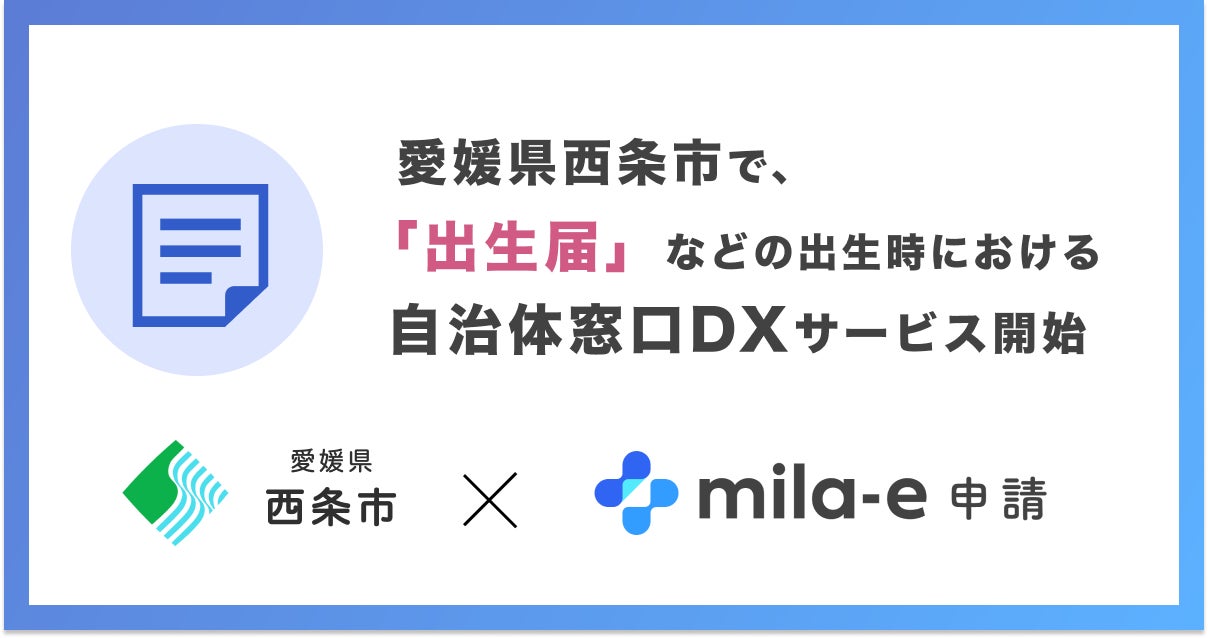 株式会社ミラボ(本社:東京都千代田区、代表取締役:谷川一也、以下「ミラボ」)は、自治体窓口DXサービス「mila-e(ミライー) 申請」の愛媛県 西条市への提供が決定し、「出生届」等の出生時に必要な6件の申請手続きにおいて、「書かない窓口」として運用を開始しました。