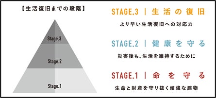 旭化成ホームズグループは、不意の自然災害において命を守る(STAGE.1)だけでなく、健康を守り(STAGE.2)、生活の復旧(STAGE.3)までを見据えた「トータルレジリエンス(総合防災力)」を提唱しています。今回優秀賞を受賞した「HEBELHAUSトータルレジリエンス2.0」は、地震・火災・水害に加え、近年の平均気温の上昇による猛暑日の増加など、より厳しくなる自然災害に対応できるよう、3つのステージそれぞれを強化しています。