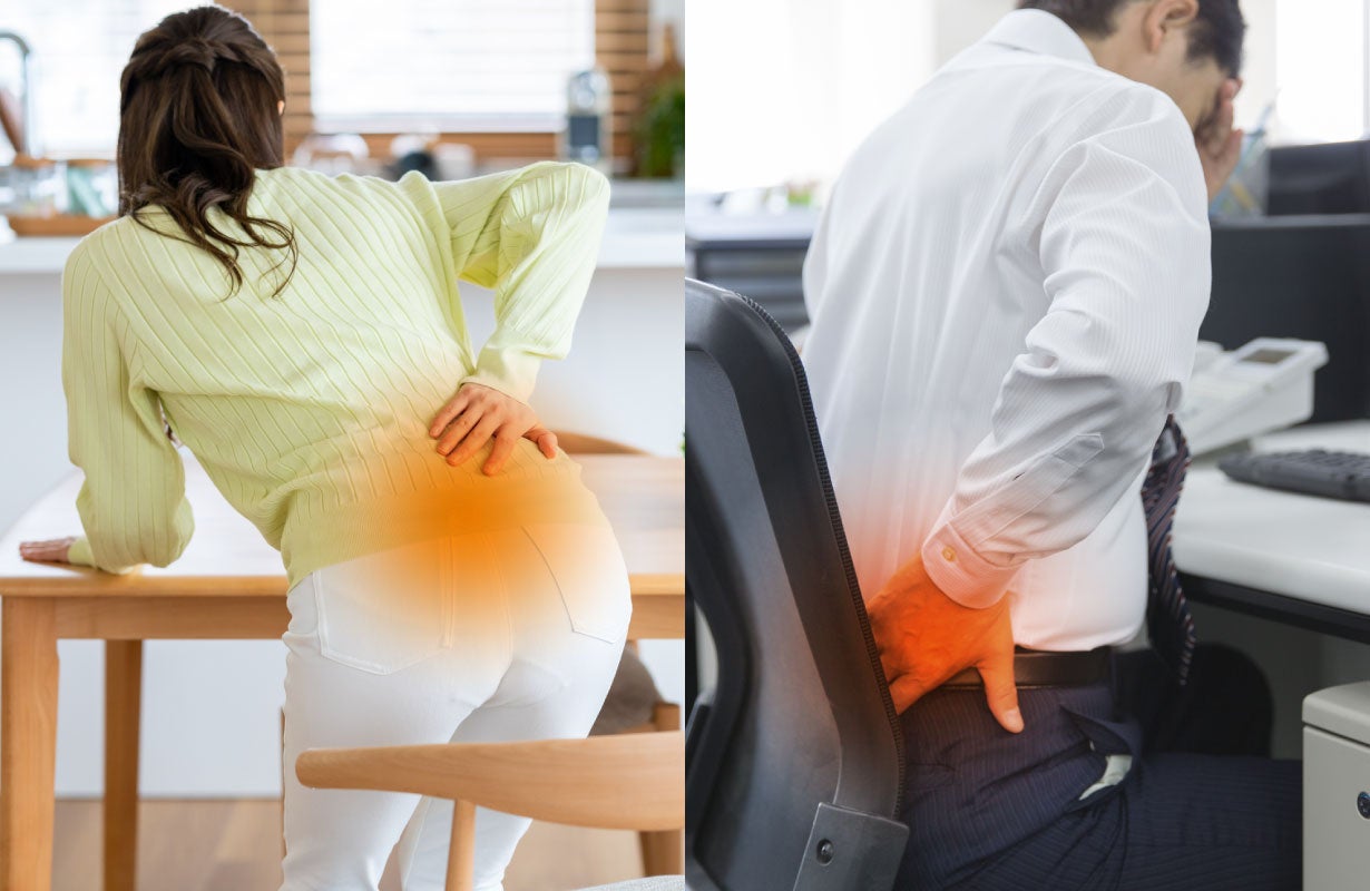 胸腰筋膜は姿勢維持に重要な部分になる為、負担がかかると背中が丸まったりする原因になります。そして、長時間の座り仕事や運動不足により、大殿筋の過度な緊張や筋力低下が腰痛や腰部の不快感を感じる原因となることがあります。