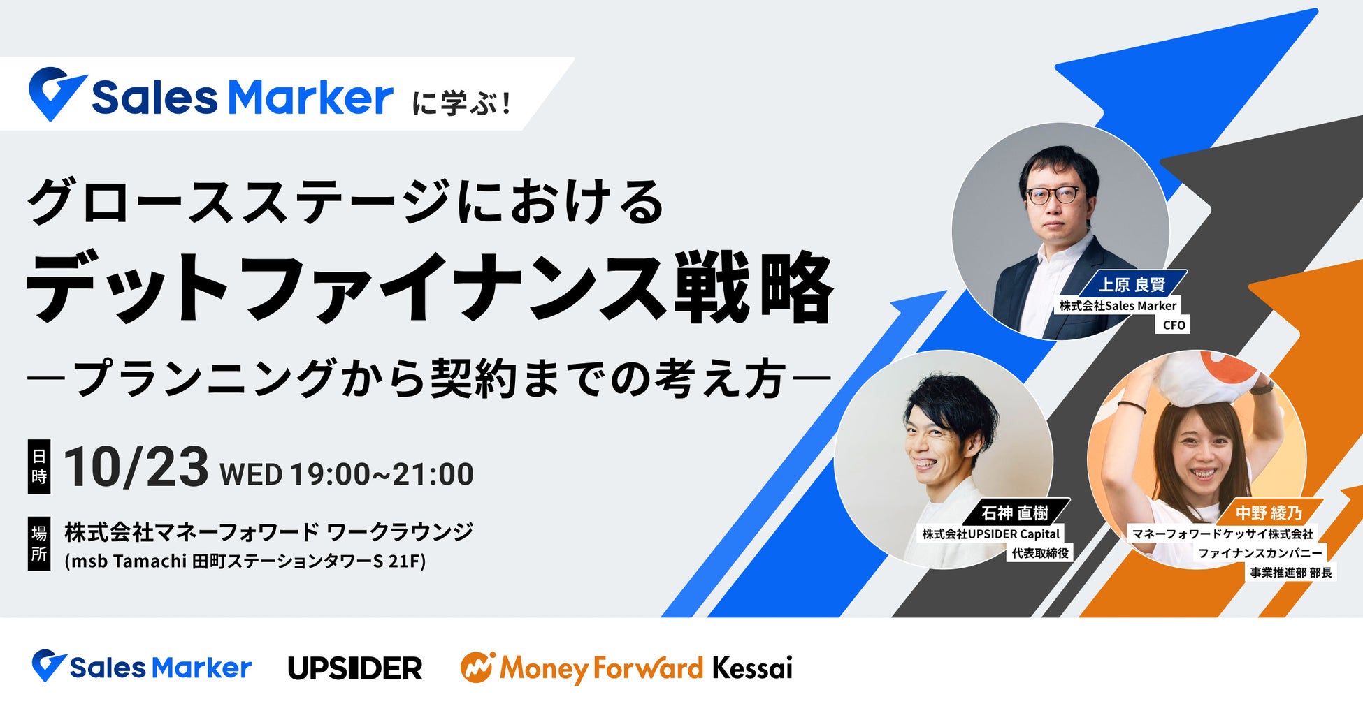 株式会社UPSIDER(代表取締役:宮城徹・水野智規、本社:東京都港区、以下 当社)と株式会社みずほフィナンシャルグループの合弁事業である、株式会社UPSIDER Capital(代表取締役:石神直樹、本社:東京都港区、以下「UPSIDER Capital」) は、マネーフォワードケッサイ株式会社と共同で、2024年10月23日(水)にオフラインセミナー「Sales Markerに学ぶ!グロースステージにおけるデットファイナンス戦略~プランニングから契約までの考え方~」(以下 本イベント)を開催いたします。