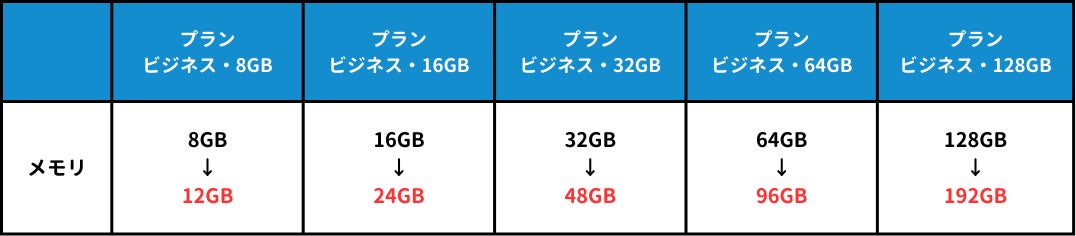メモリ容量を無料で1.5倍に増設できる機能です。対応プランと拡張前後のメモリ容量は以下の通りです。