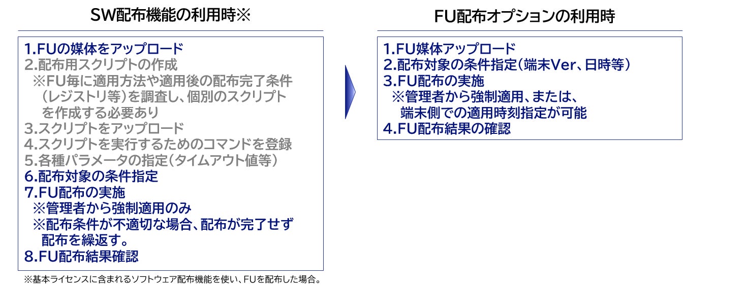 FU配布設定の手順を8ステップから4ステップに半減します。具体的には、FU毎に、適用方法や適用後の配布完了条件を指定した配布用スクリプトの作成などの作業を行う必要は無く、FU媒体のアップロード後に配布対象の条件を指定するだけで、FUの配布から適用までを実行できます。配布設定は、配布のみ、または配布および適用などを予め選択することが可能です。