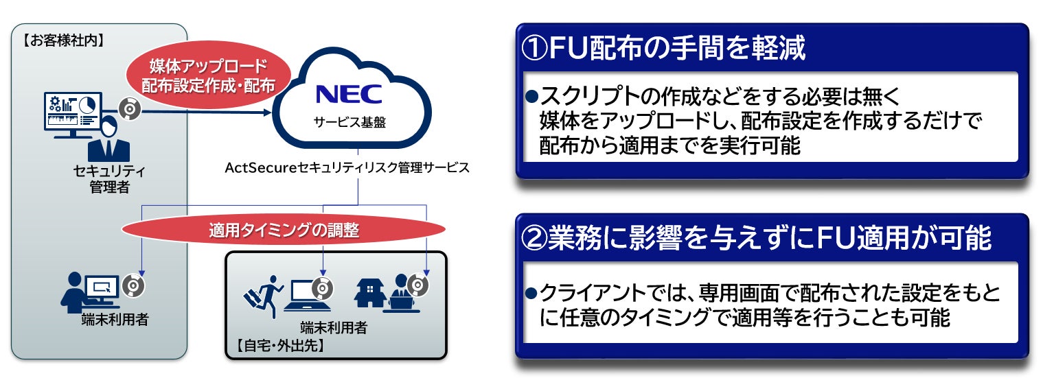 NECは、「ActSecureセキュリティリスク管理サービス」のFU配布オプションのメニューを新たにラインナップに加えることで、FUの配布や適用における運用負荷や業務への影響といった課題を解決し、お客様のICT環境のサイバーハイジーンの実現、セキュリティ向上を支援いたします。