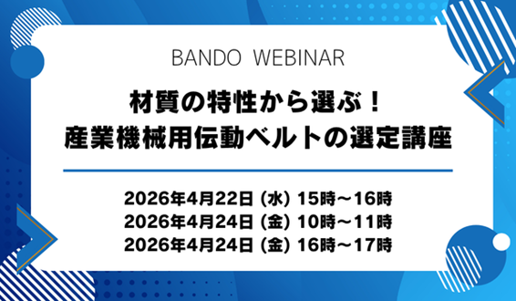 バンドー化学株式会社(本社:兵庫県神戸市)は、ウェビナー「材質の特性から選ぶ!産業機械用伝動ベルトの選定講座」を開催いたします。産業機械に用いられる伝動ベルトにはさまざまな品種があり、それぞれに多様な材質が用いられているため、用途や要求品質に応じて適切な伝動ベルトを選択する必要があります。本ウェビナーでは、まず伝動ベルトのアプリケーション事例をご紹介します。さらに伝動ベルトに用いられる「ゴム」や「ウレタン」の材質の基本特性などを解説することで、用途や要求品質に応じた伝動ベルトの選び方を学んでいただけます。