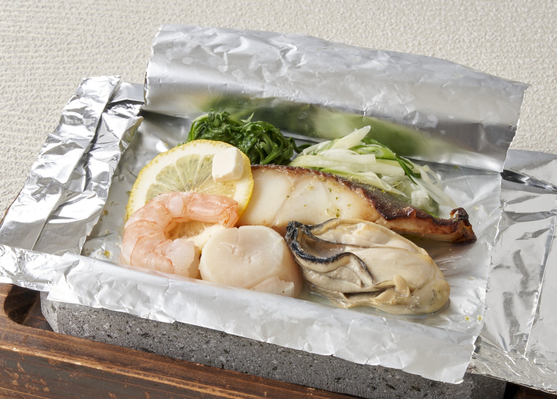 銀だらをメインに、牡蠣・海老・帆立などの海鮮をホイル焼きにしました。
